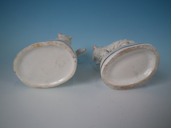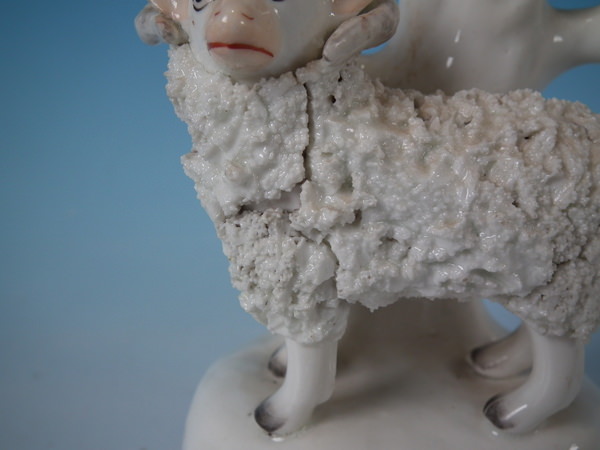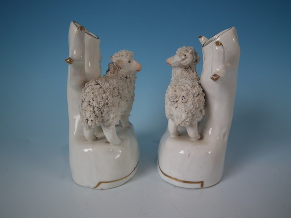 Pair of Staffordshire porcellaneous spill vases with a pastoral theme which feature a ram and ewe, stood on an oval base.