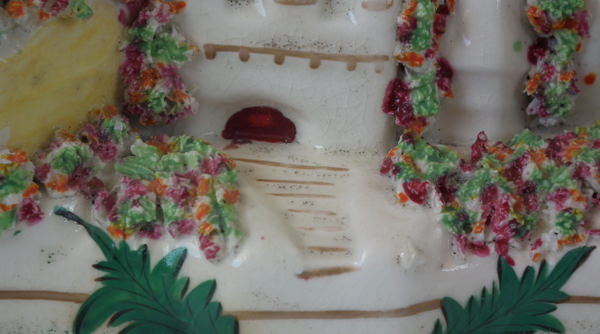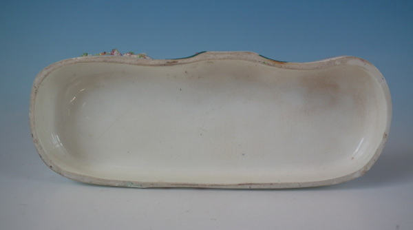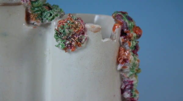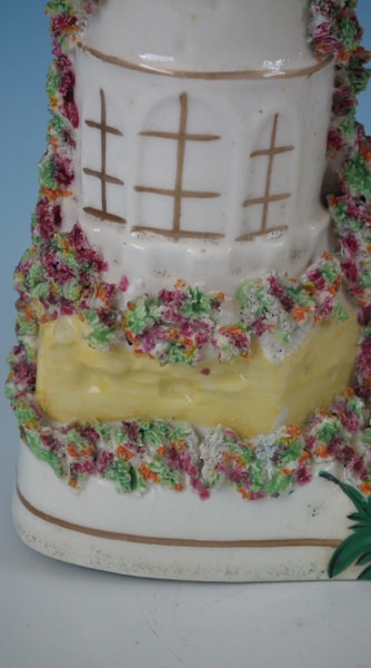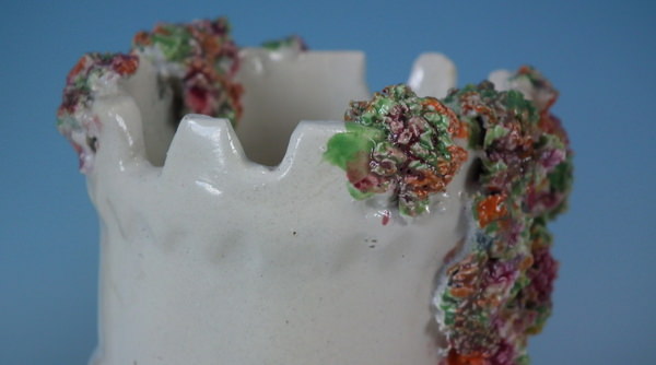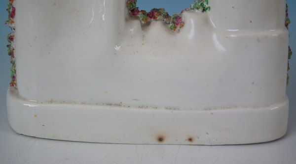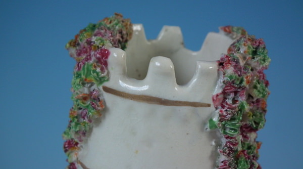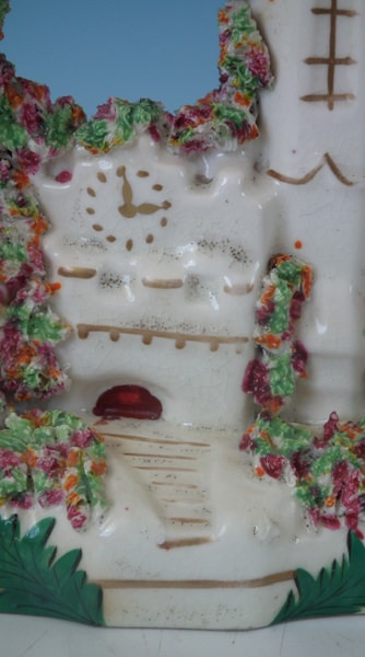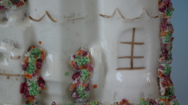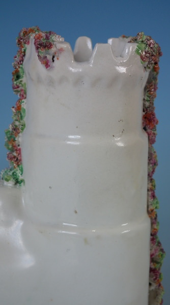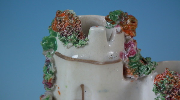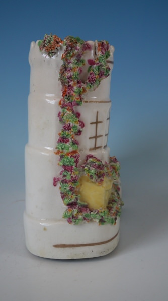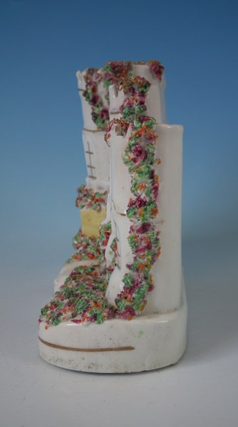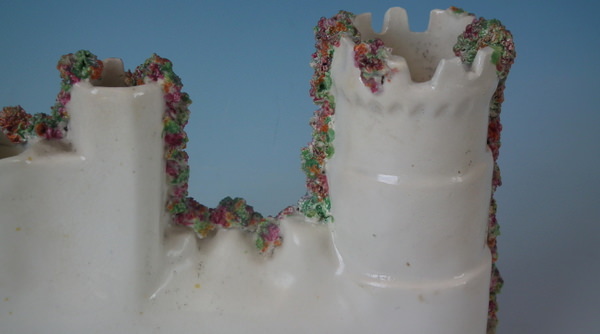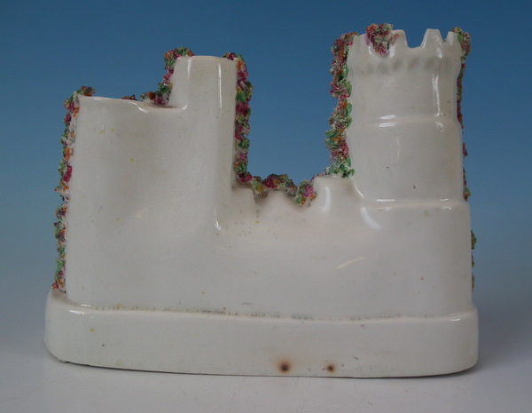 Victorian, circa 1860. 5.3ins high, 7.3ins wide, 2.8ins depth. Staffordshire castle which features a clock and three turrets, stood on a leaf embellished base.