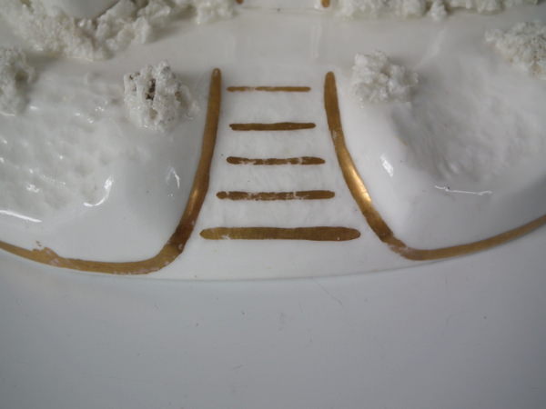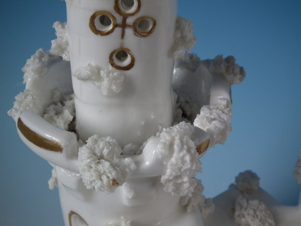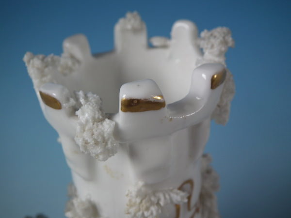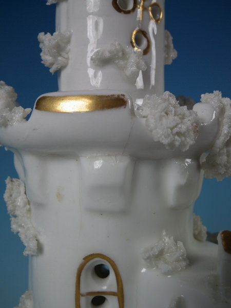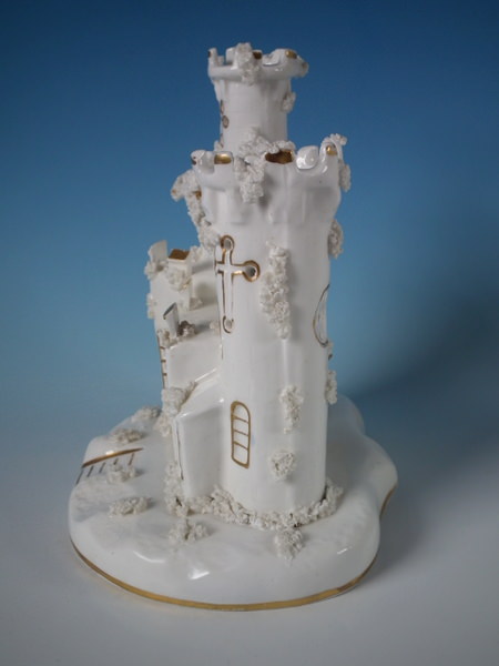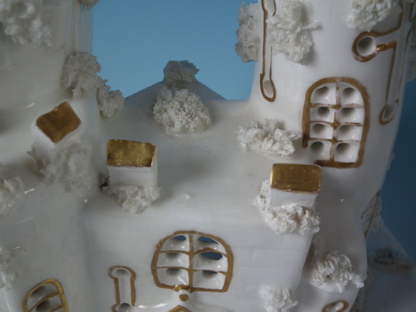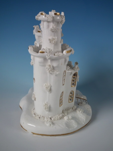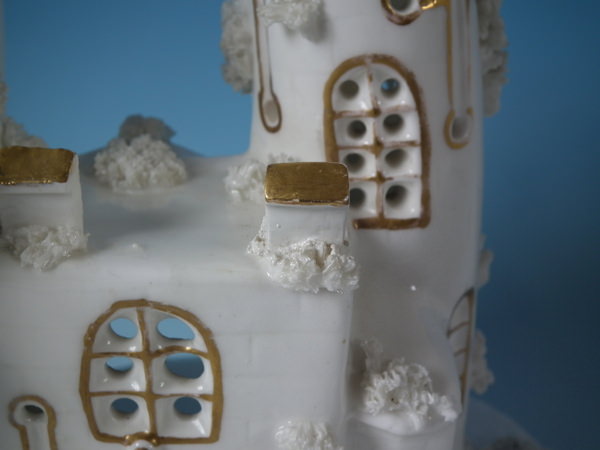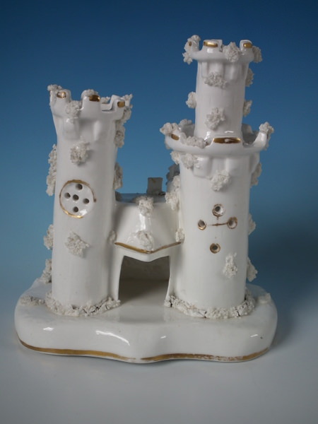 Victorian, circa 1840. 9.8ins high, 9.1ins wide, 7.5ins depth. Alcock Staffordshire pastille burner which features a castle with three turrets, stood on a shaped base.