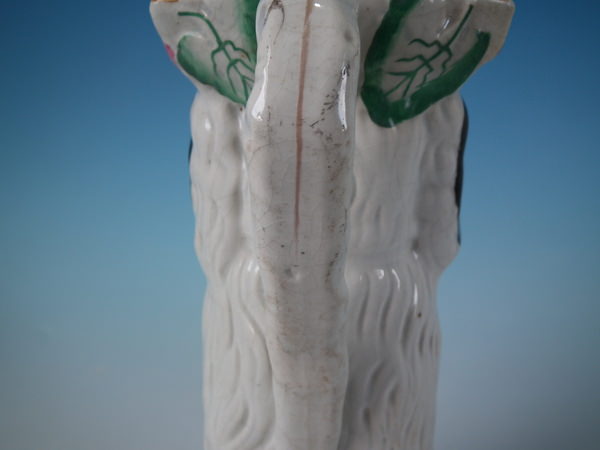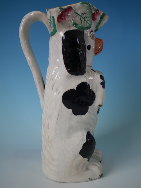 Victorian, circa 1860. 10.7ins high, 4.5ins wide, 5.5ins depth. Staffordshire jug/pitcher which features a begging spaniel modelled with tricorn hat, floral decoration and ochre line around rim, stood directly on the ground, no base. Black and white version. Dull gilt embellishment.