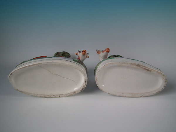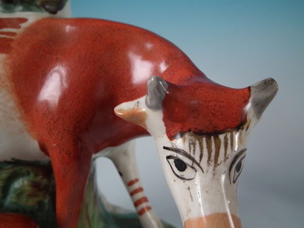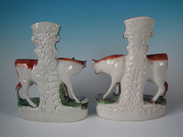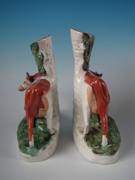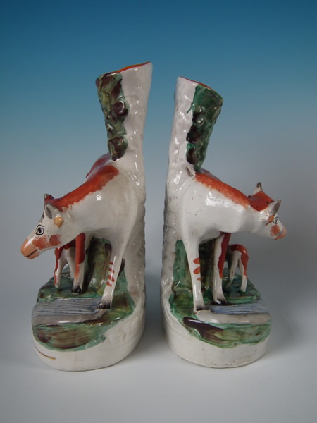 Victorian, circa 1880. Tallest is 11ins high, 8.3ins wide, 4.3ins depth. Pair of Staffordshire spill vases with a pastoral theme which feature cow with her calf beside a stream,