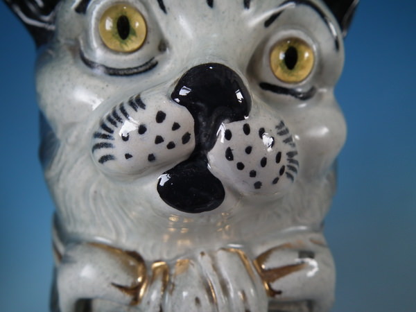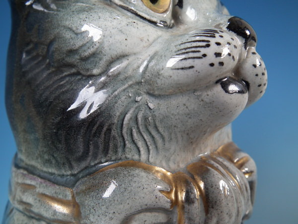 KILN EFFECTS: a few specks of kiln detritus caught in the glaze to the cat's face;