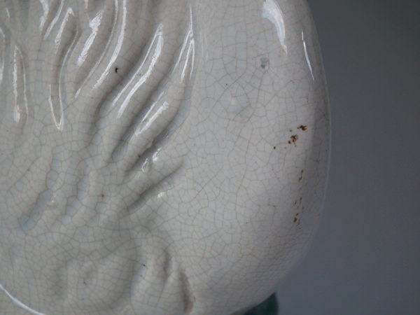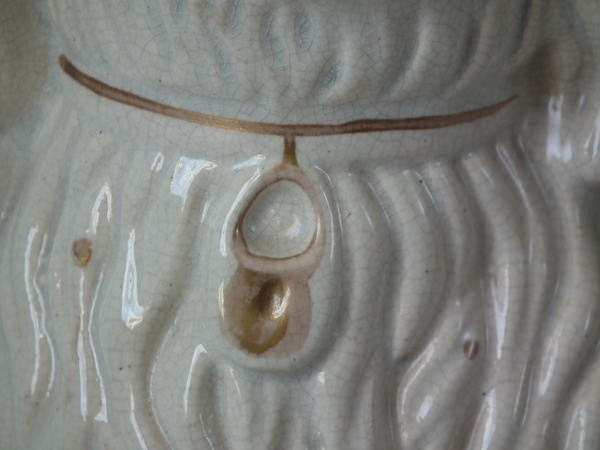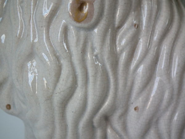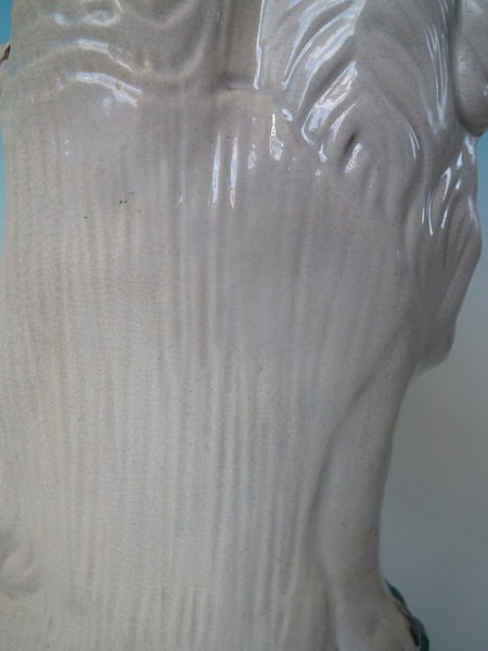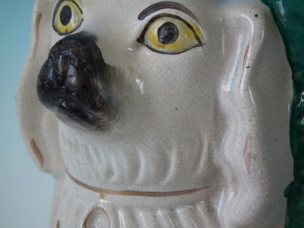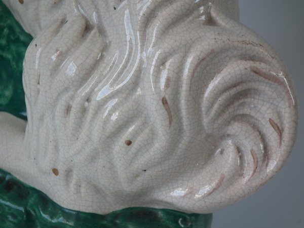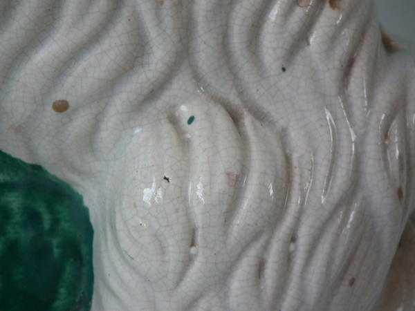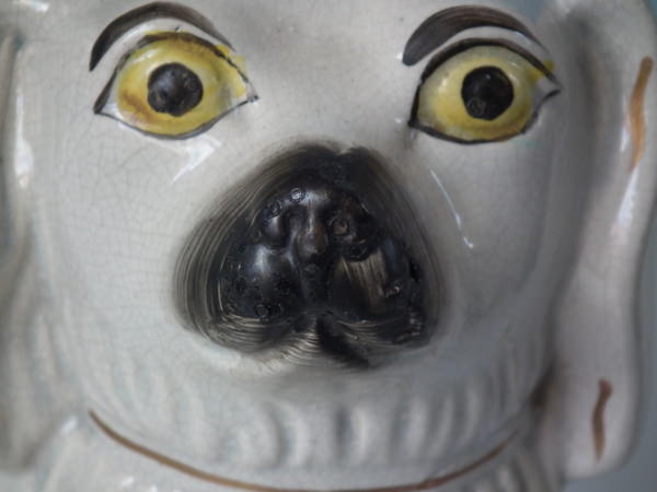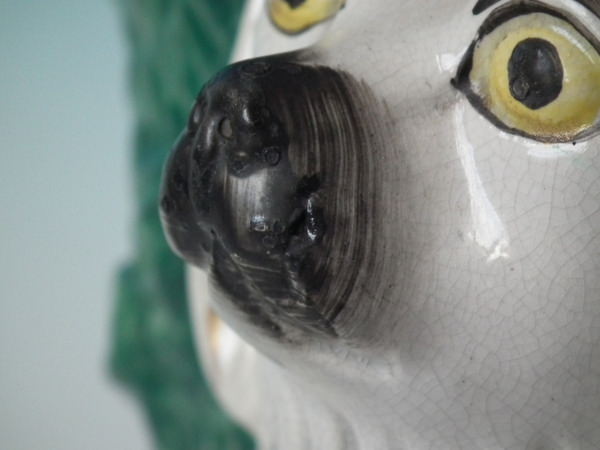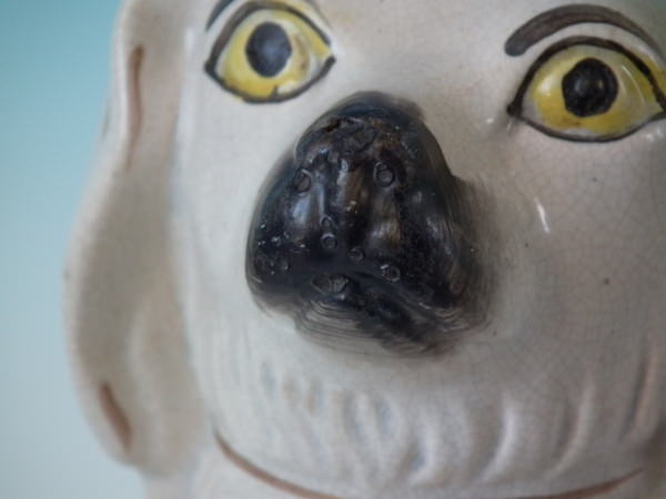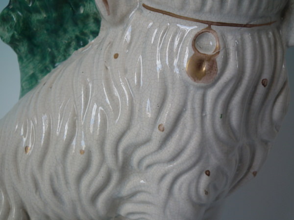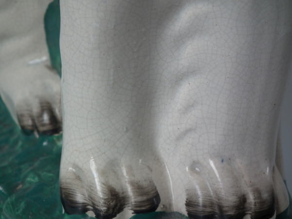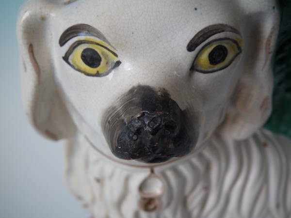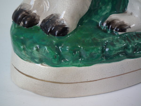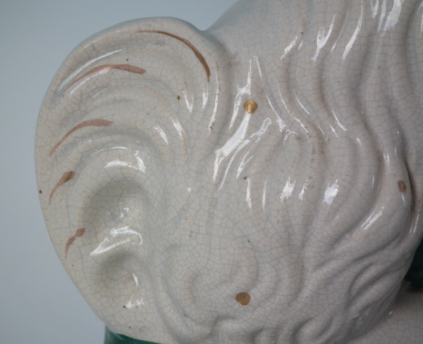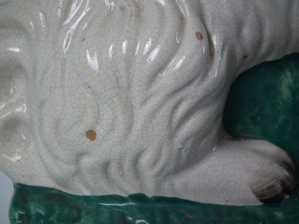 a few specks of kiln detritus caught in the glaze to the spaniel's chest and legs;