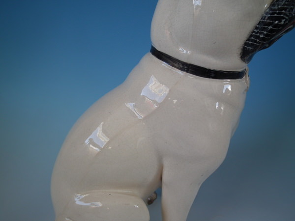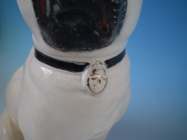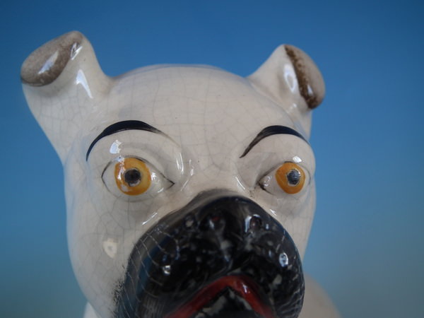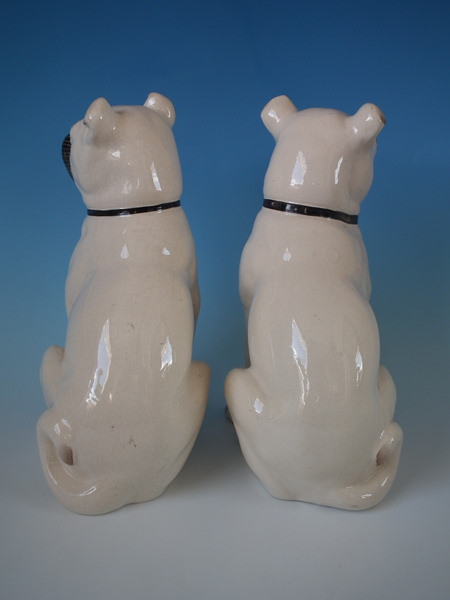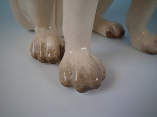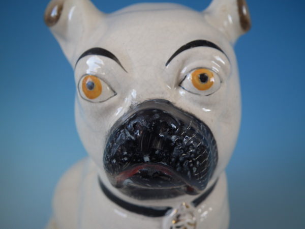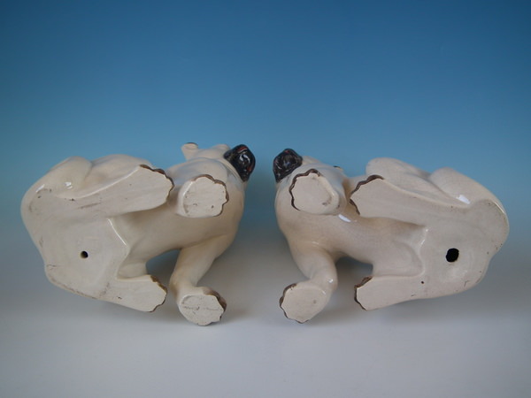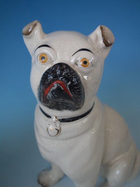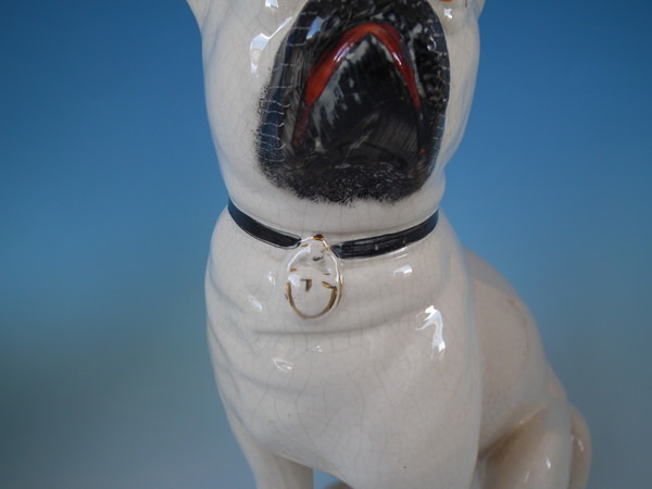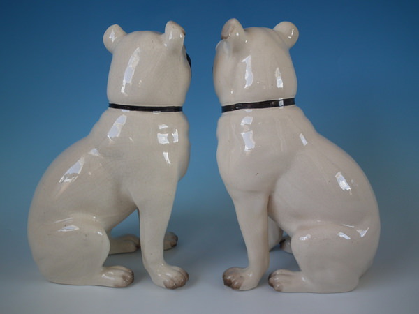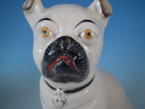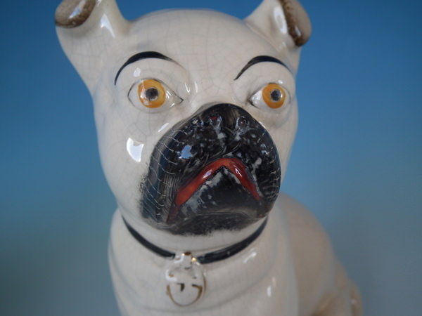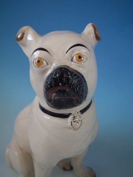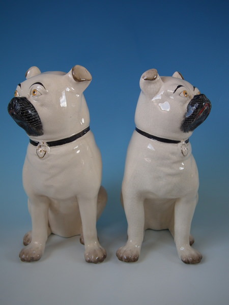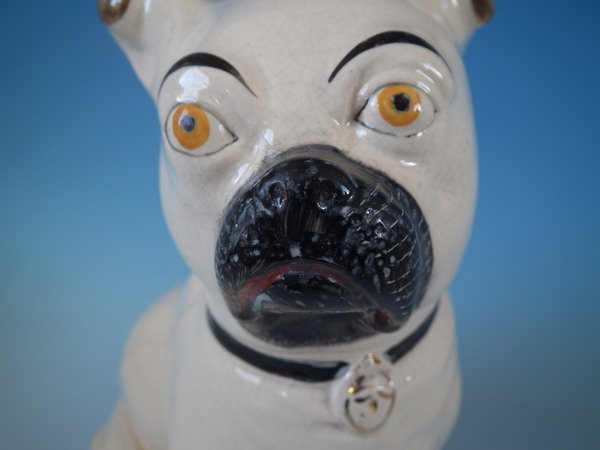 Victorian, circa 1880. Tallest is 11.2ins high, 5.3ins wide, 7.1ins depth. Pair of Staffordshire figures which feature a pug, seated directly on the ground, no base.