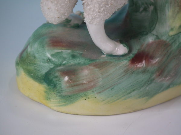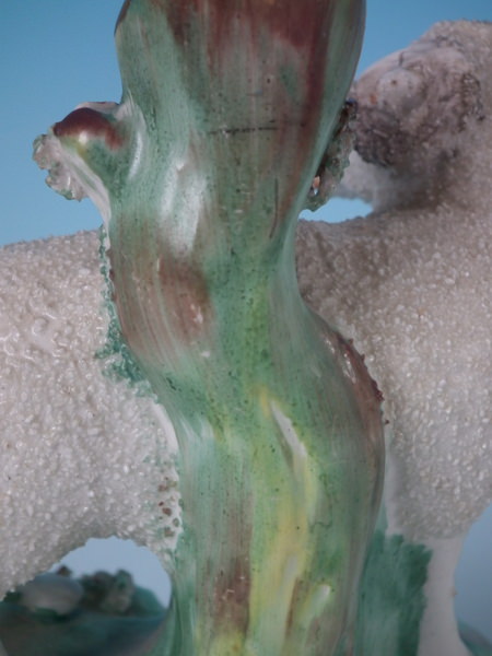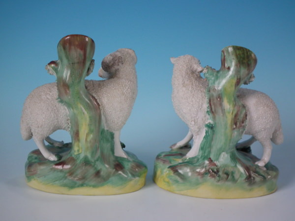 Pair of Parr Factory Staffordshire spill vases which feature a ram and ewe in front of a tree stump, stood on an oval base.