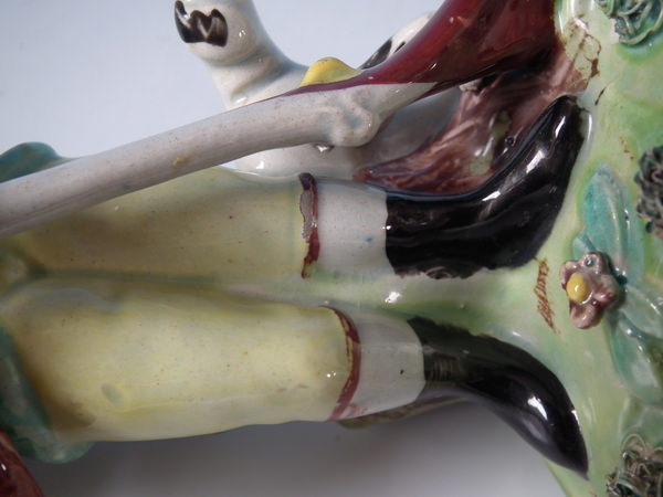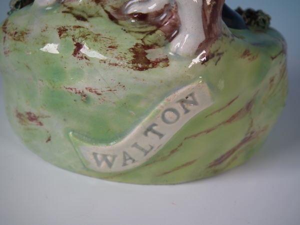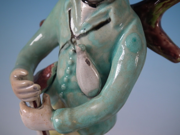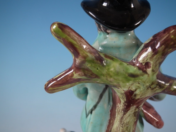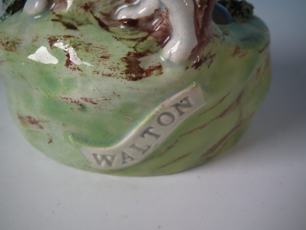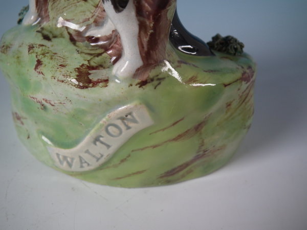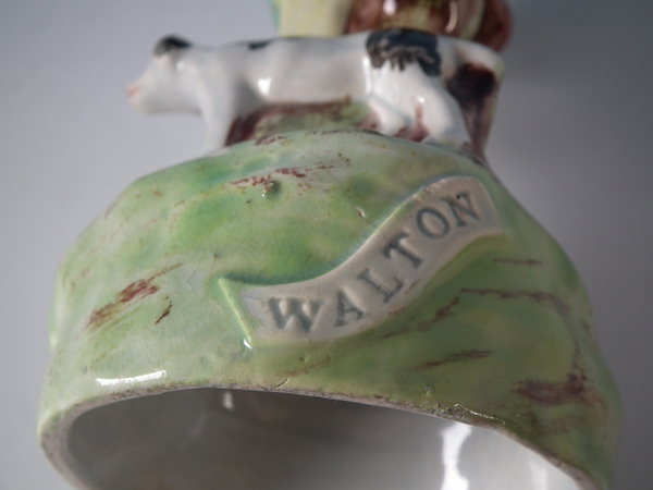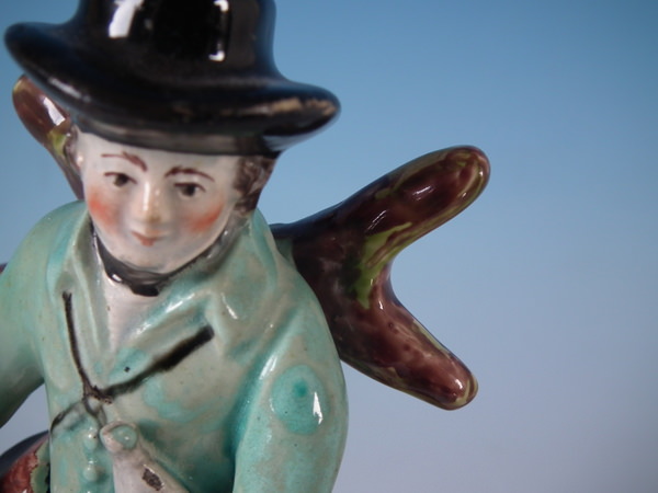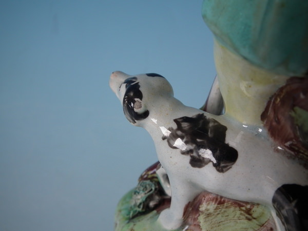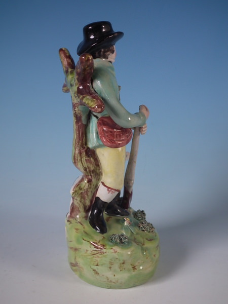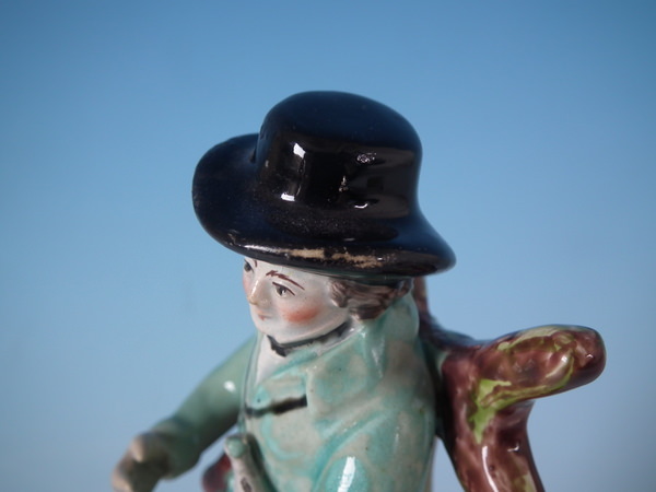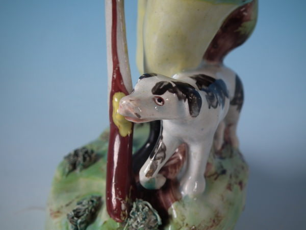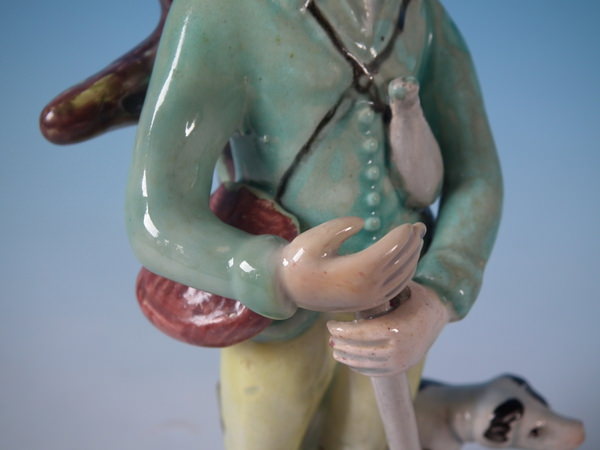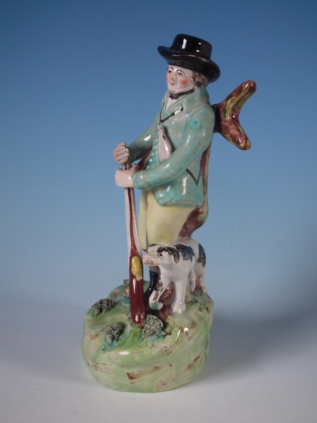 pre-Victorian, circa 1820. 7.5ins high, 3.3ins wide, 3.3ins depth. Walton Staffordshire pearlware figures with a hunting theme which features