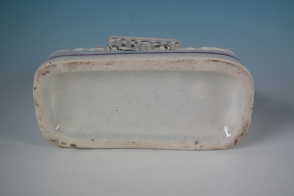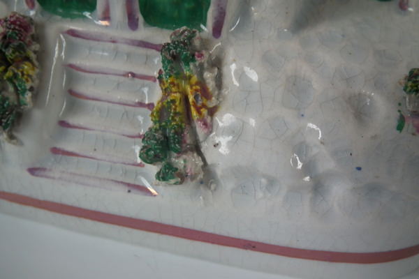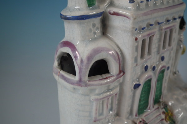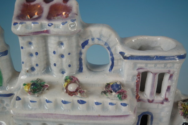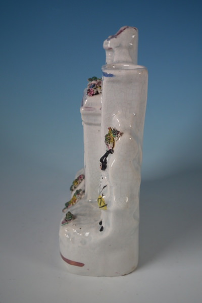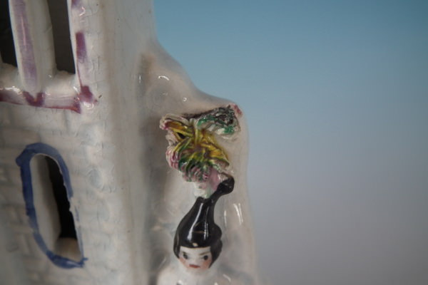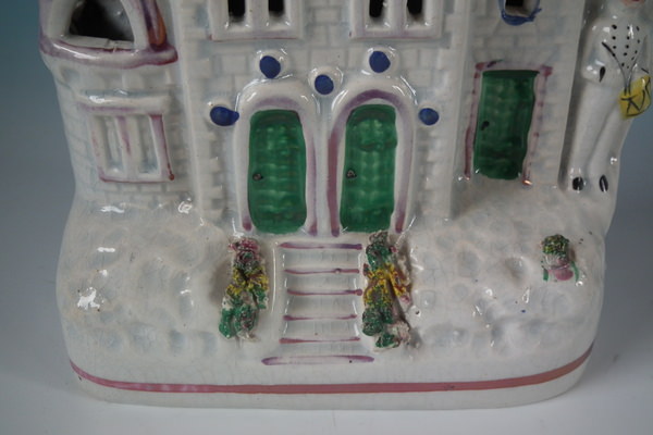 Victorian, circa 1860. 7.3ins high, 6.1ins wide, 2.8ins depth. Staffordshire castle with a musical theme which features a drummer boy, stood on an oblong base.