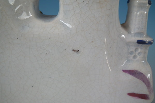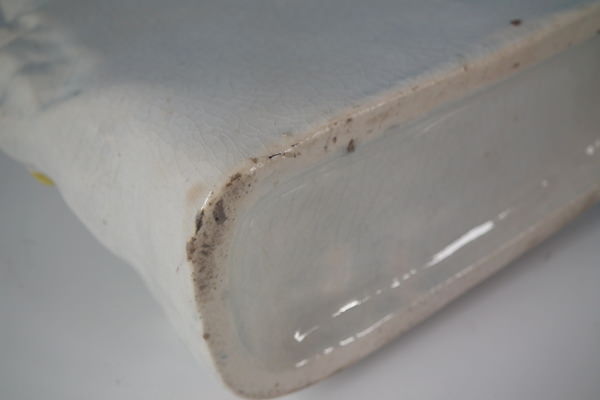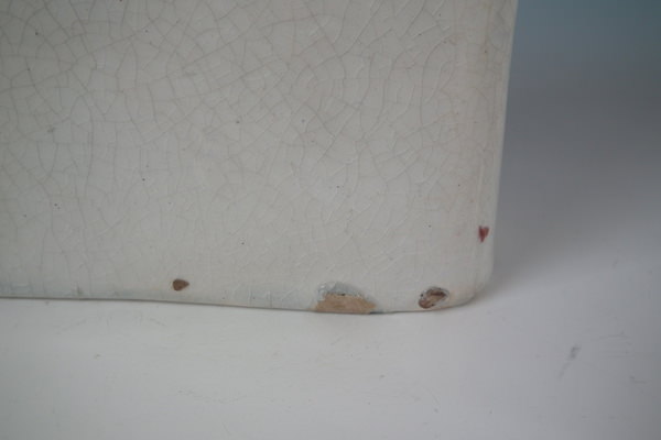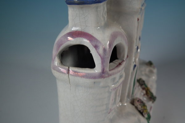 KILN EFFECTS: shrinkage crack to rim of window on left tower;