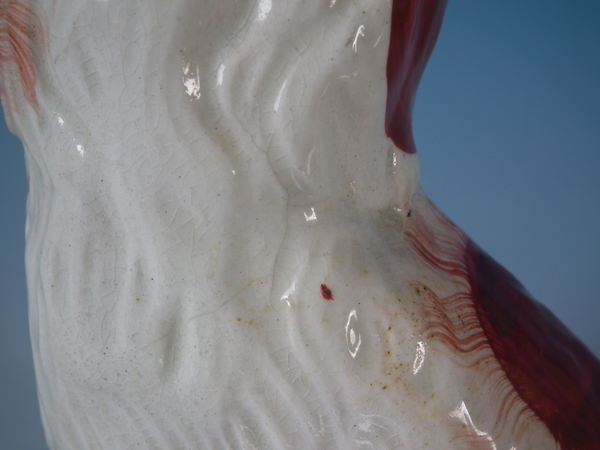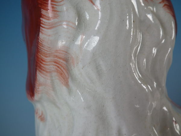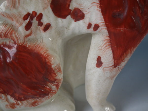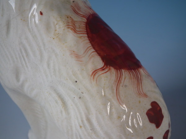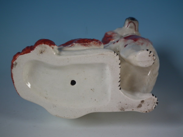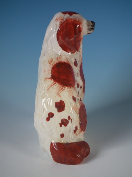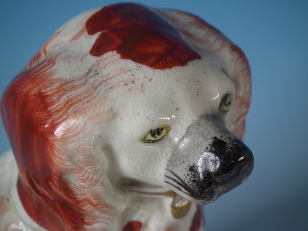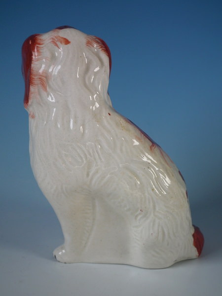 Victorian, circa 1860. 7.1ins high, 5.1ins wide, 2.8ins depth. Staffordshire figure which features a leg free spaniel, seated directly on the ground, no base.