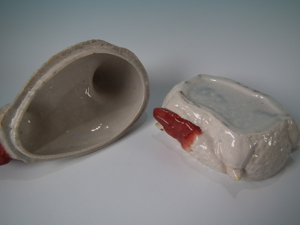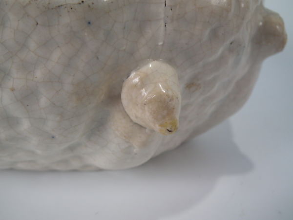 Victorian, circa 1880. 8.7ins high, 10.2ins wide, 7.1ins depth. Staffordshire egg tureen and cover which features a hen with her seven chicks.