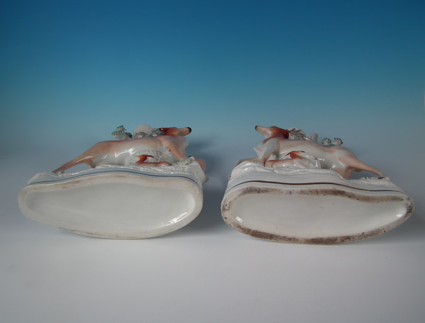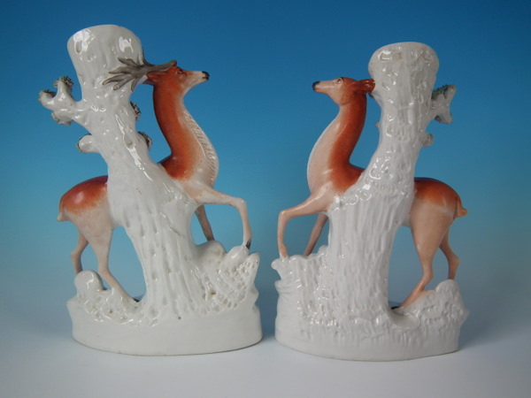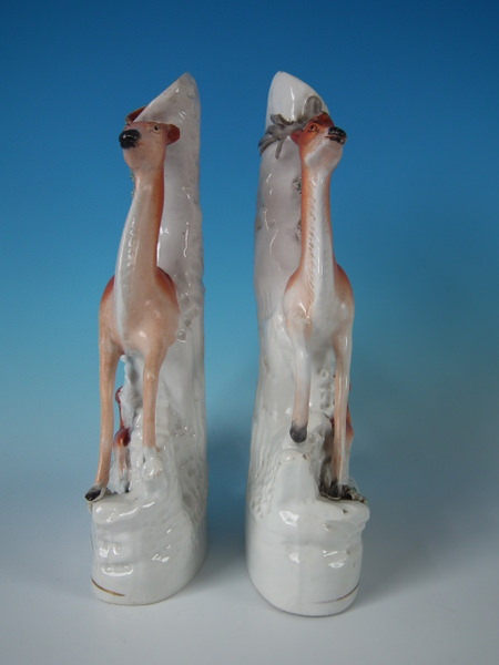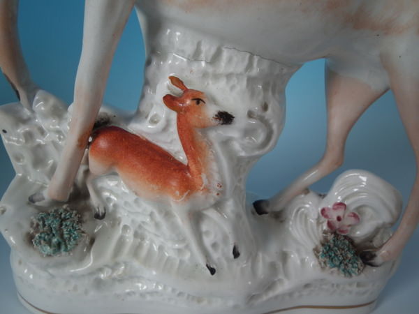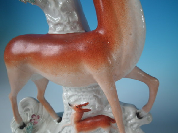 Victorian, circa 1860. Tallest is 11.2ins high, 7.7ins wide, 3ins depth. Pair of Staffordshire spill vases which feature a stag and doe each with a fawn, stood on a shaped base.