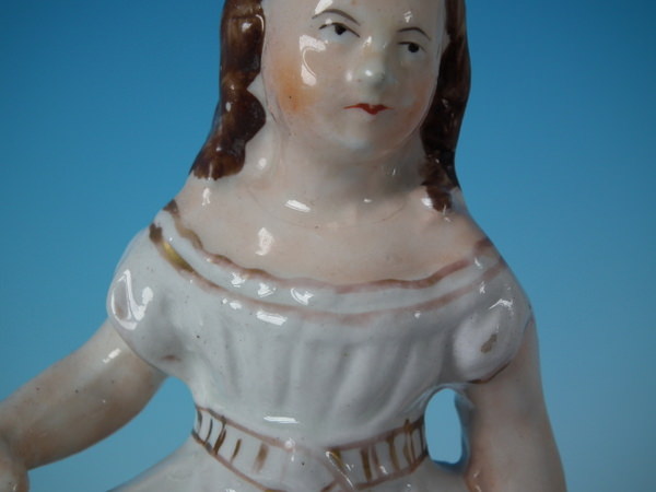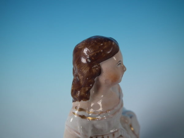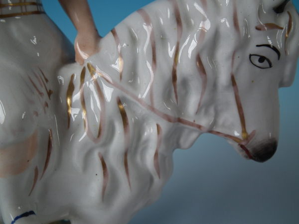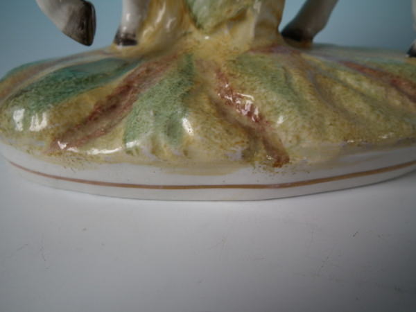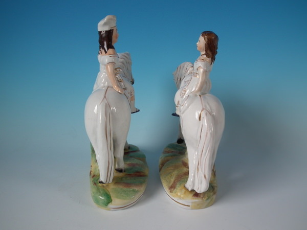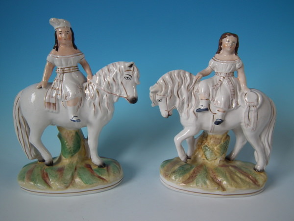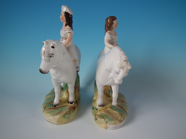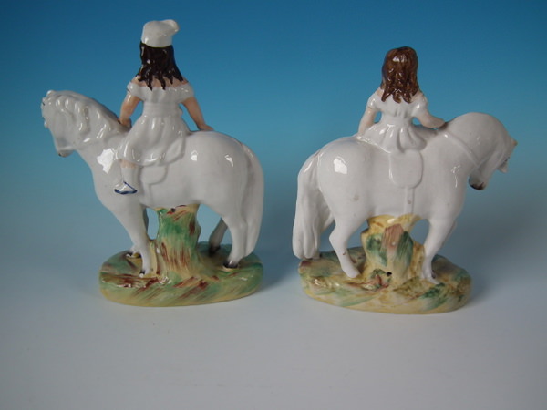 Victorian, circa 1870. Tallest is 9.3ins high, 7.1ins wide, 3.3ins depth. Pair of Staffordshire figures which feature a boy and a girl on horseback/ponies, stood on an oval base.