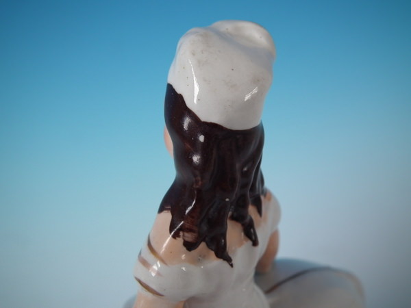 KILN EFFECTS: over glazed shrinkage line around her neck.
