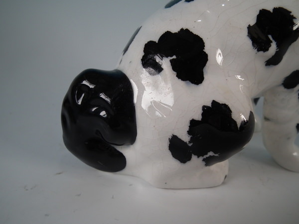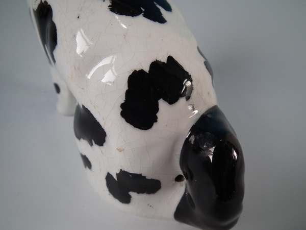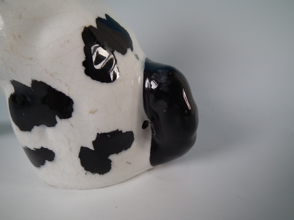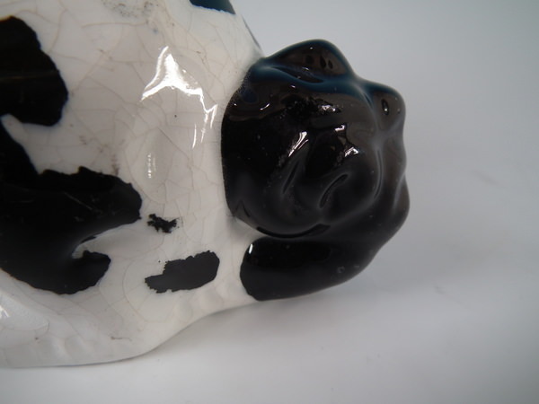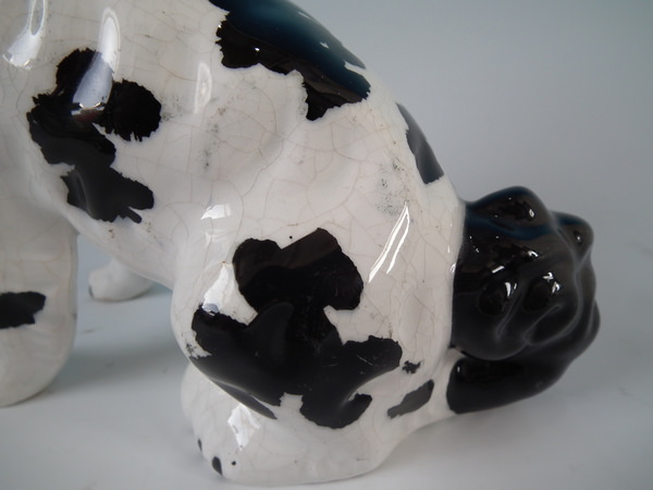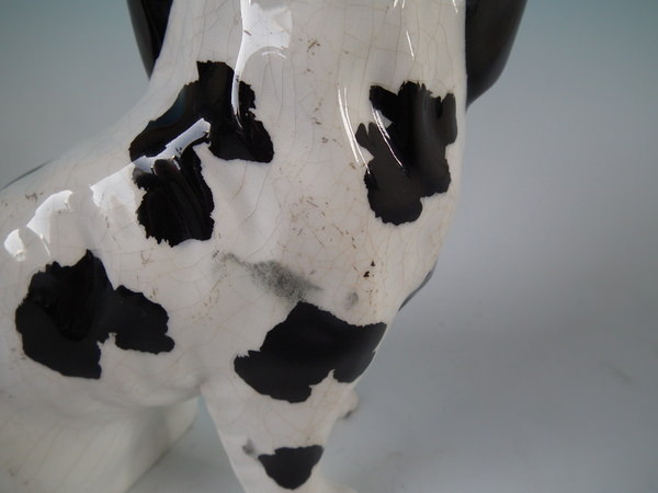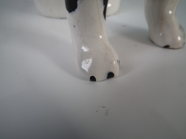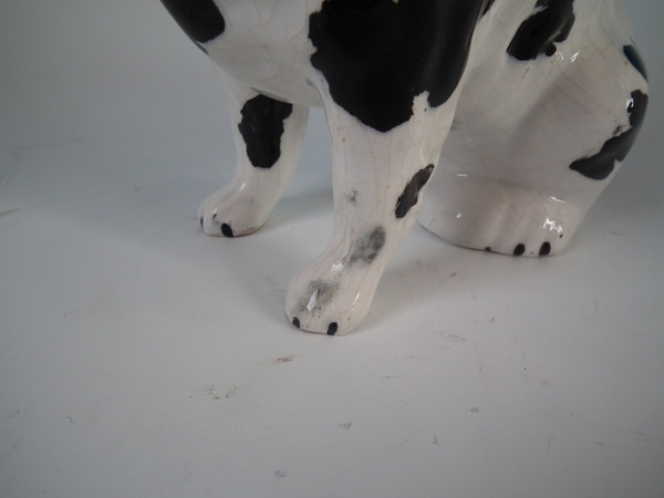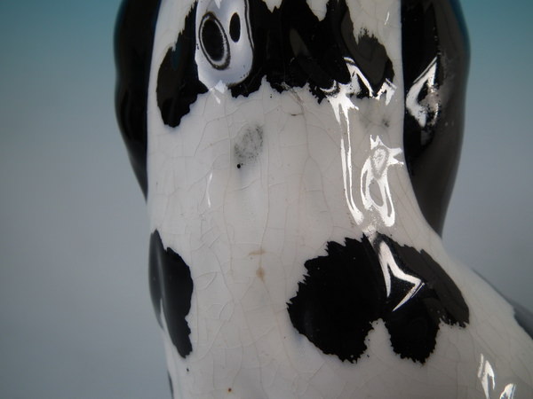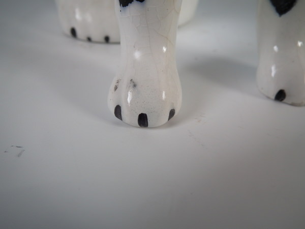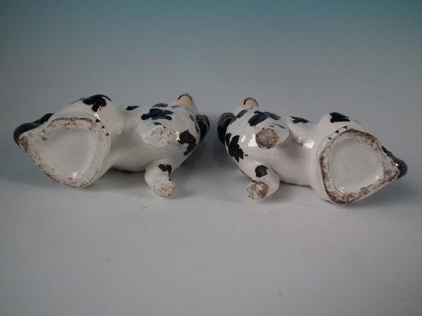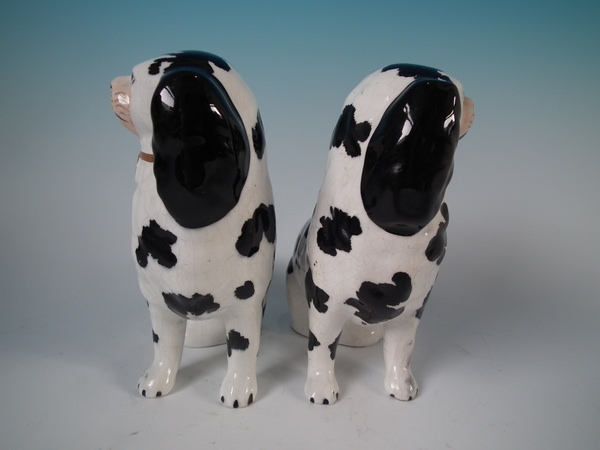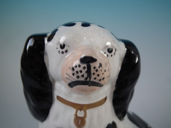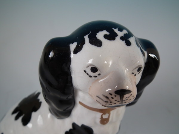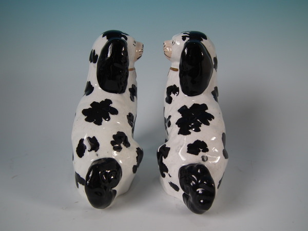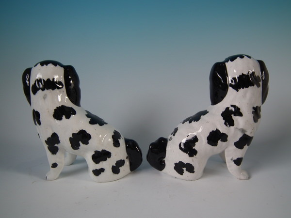 Pair of Staffordshire figures which feature a Disraeli spaniel with both front legs free, seated directly on the ground, no base. Black and white version.