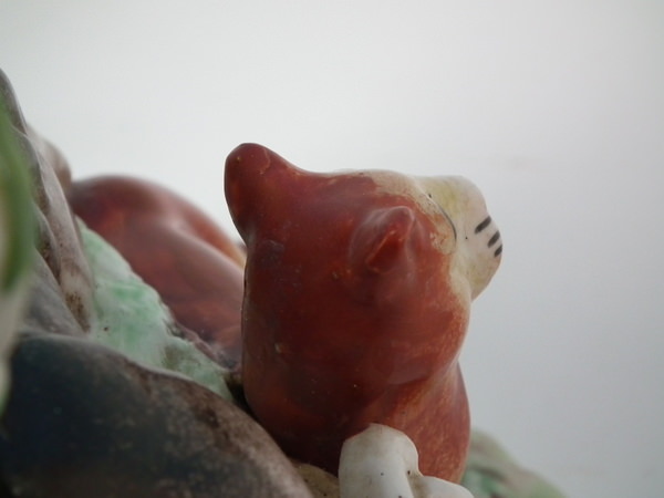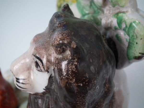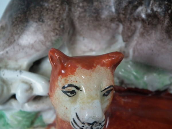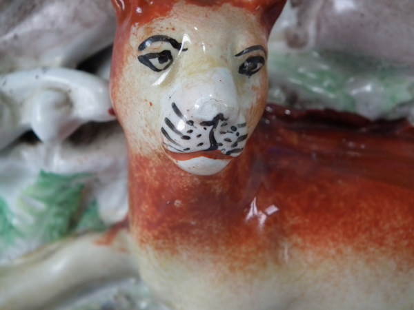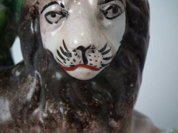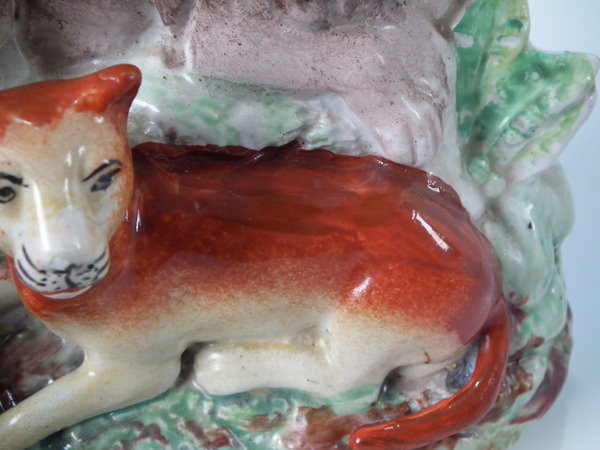 Victorian, circa 1900. 8.3ins high, 6.3ins wide, 4.5ins depth. Staffordshire group which features a palm tree in the background and a lion and a lioness, recumbent on a circular base. Multi-coloured version.