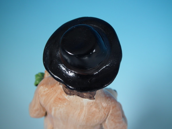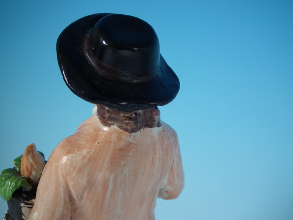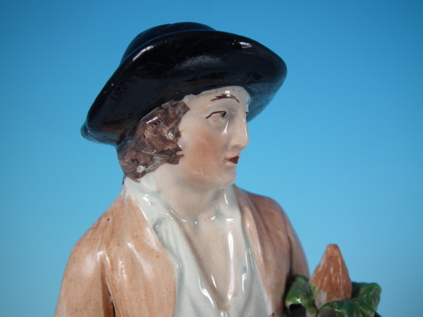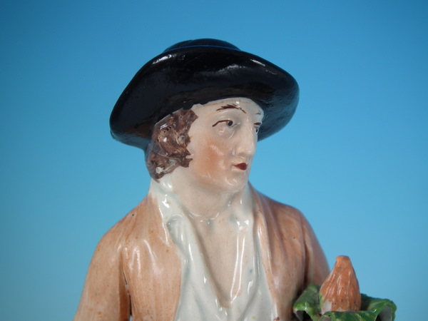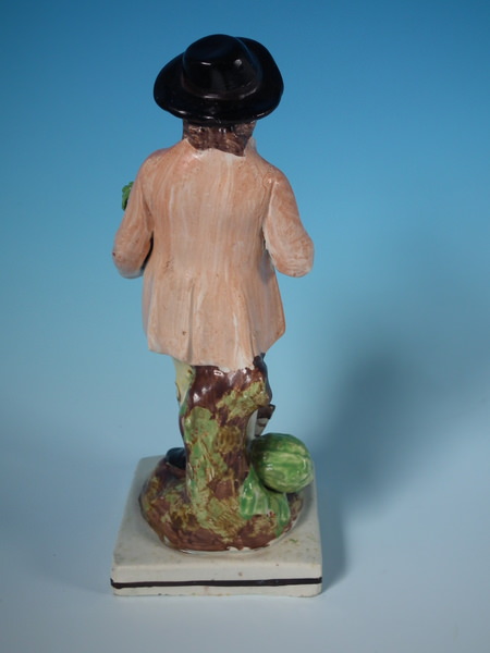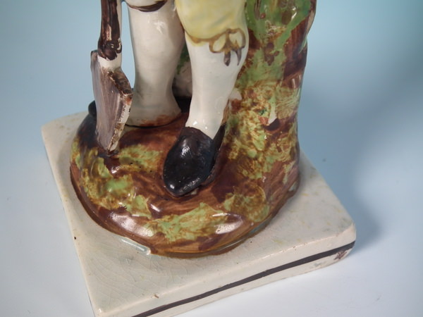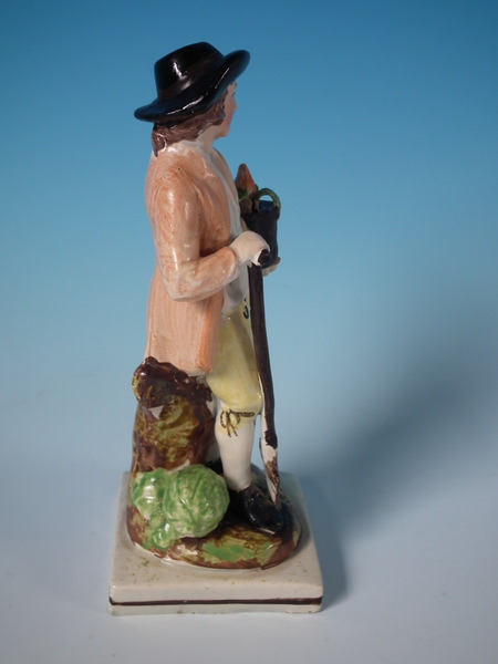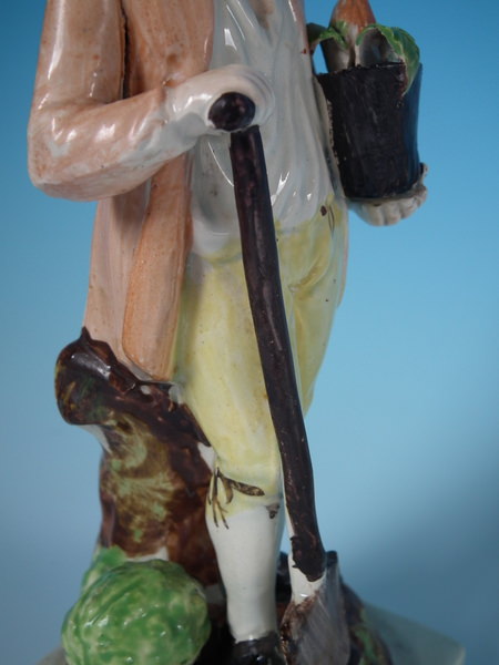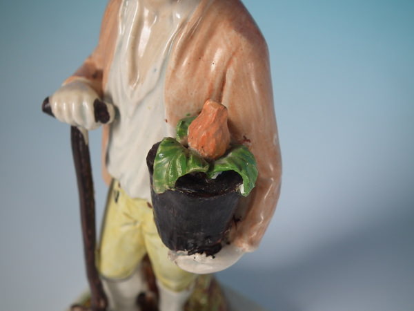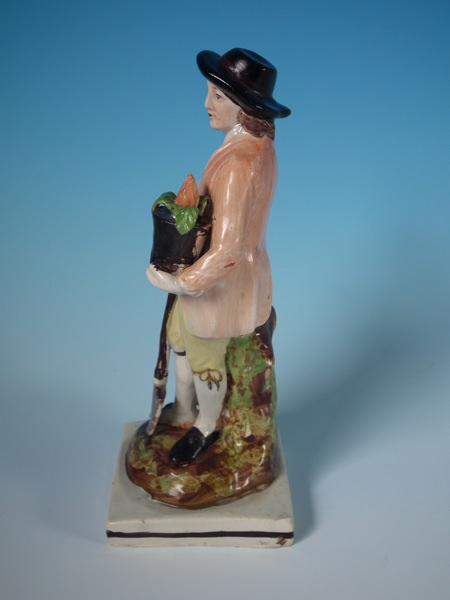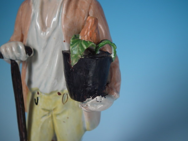 pre-Victorian, circa 1820. 6.7ins high, 2.6ins wide, 2.6ins depth. Staffordshire pearlware figure with a pastoral theme which features a gardener,
