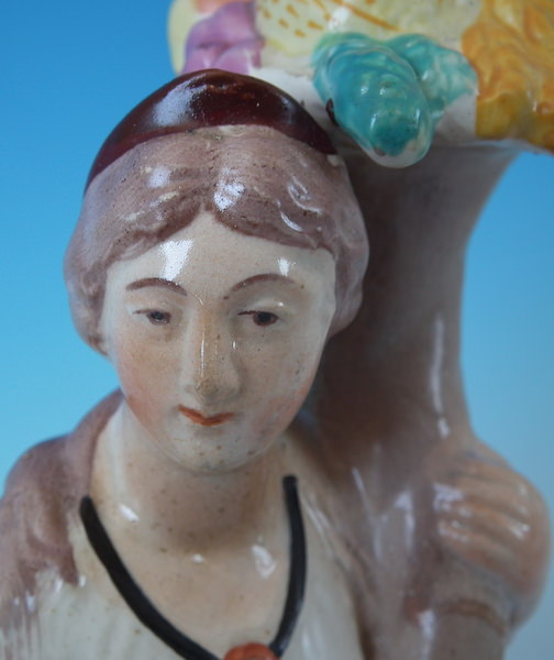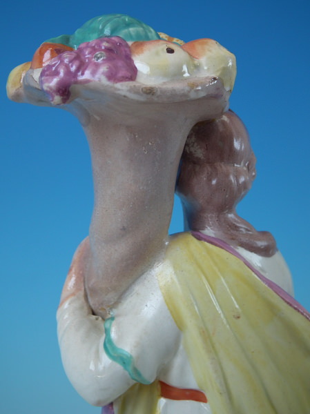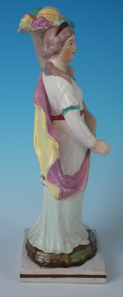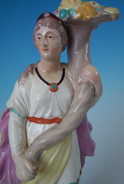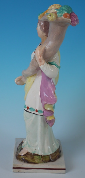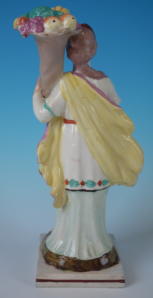 pre-Victorian, circa 1820. 10.2ins high, 3.5ins wide, 3.5ins depth. Staffordshire pearlware figure with a classical theme which features Flora holding a cornucopia full of fruit, stood on a square base. Painted base line.