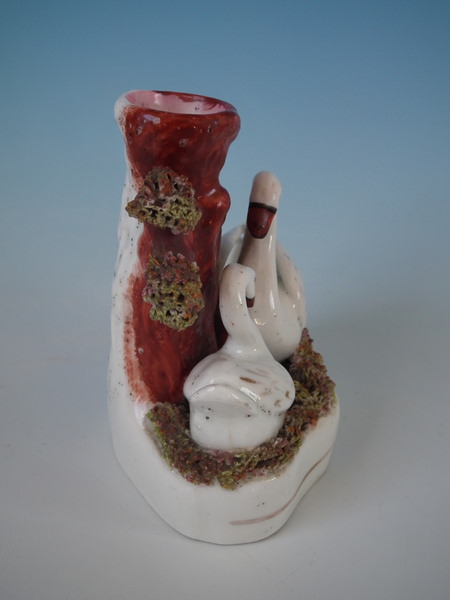 Victorian, circa 1850. 4.3ins high, 4.3ins wide, 2.8ins depth. Staffordshire spill vase which features a swan and cygnet, resting on a shaped base.