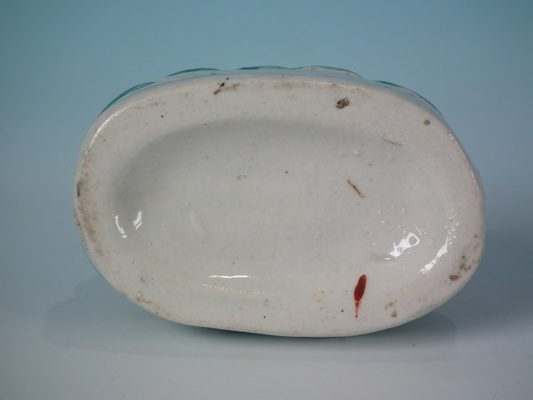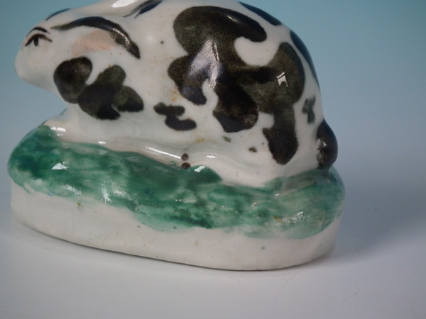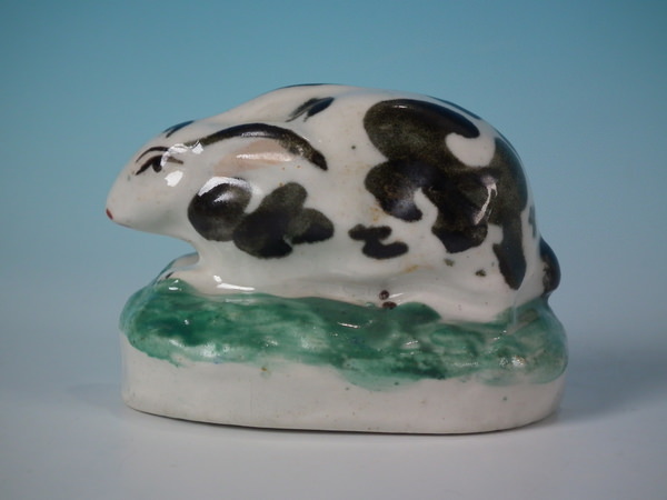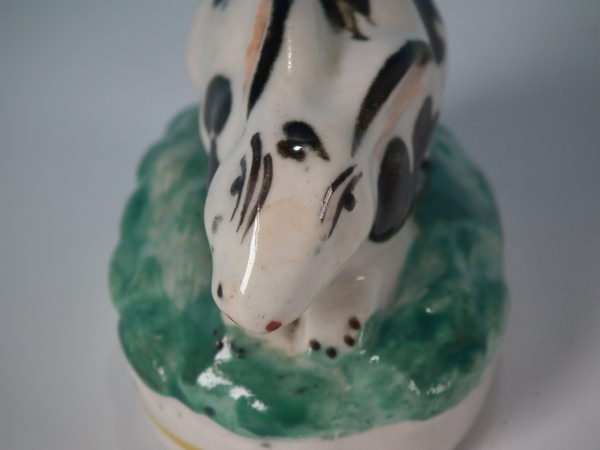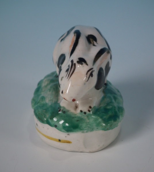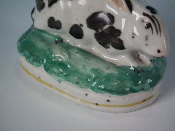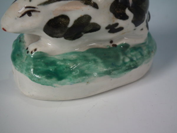 Staffordshire figure which features a rabbit, resting on an oval base. Multi-coloured version.