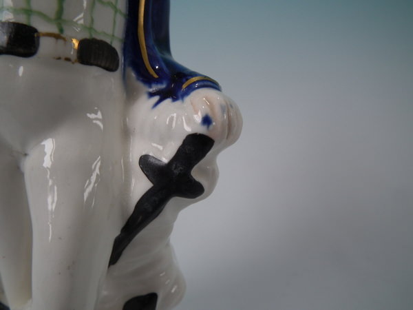 Multi-coloured with underglaze blue version. Dull gilt base line and embellishment. Decorated 'in the round' - decoration to front and reverse. Open bottomed.