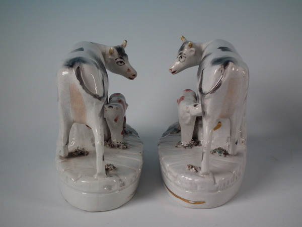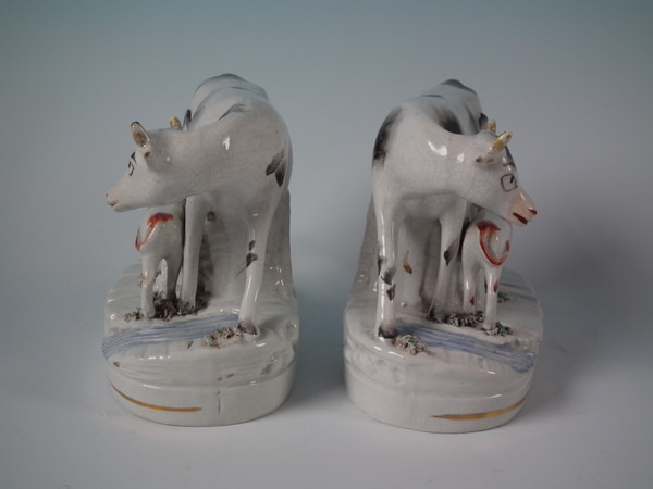 Pair of Staffordshire figures which feature a cow with her calf beside a stream, stood on an oval base. Black and white version.