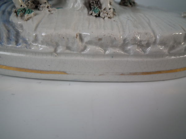 Small flake to upper base edge at front and cow's hind left leg.