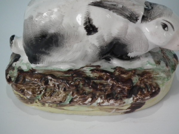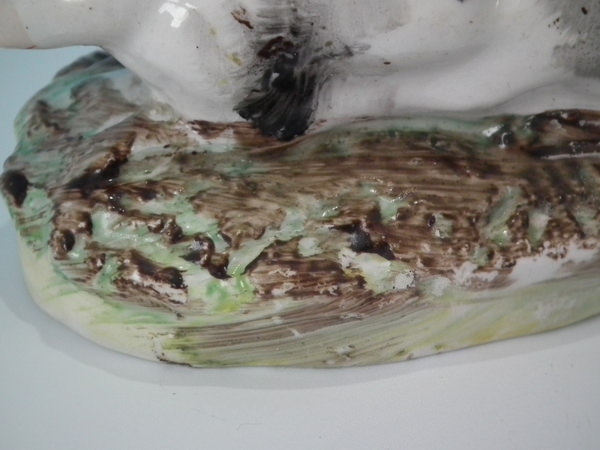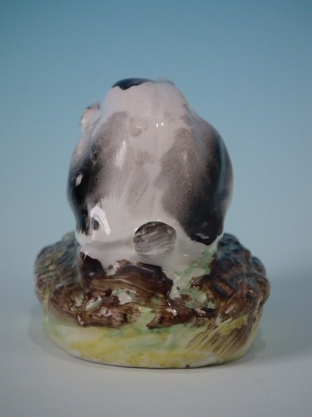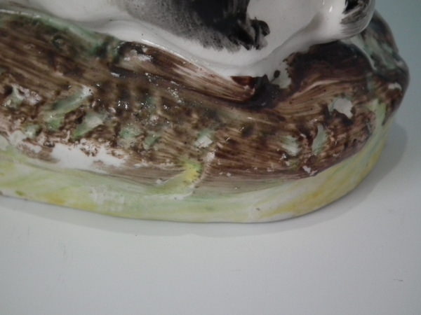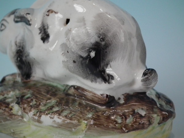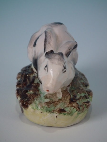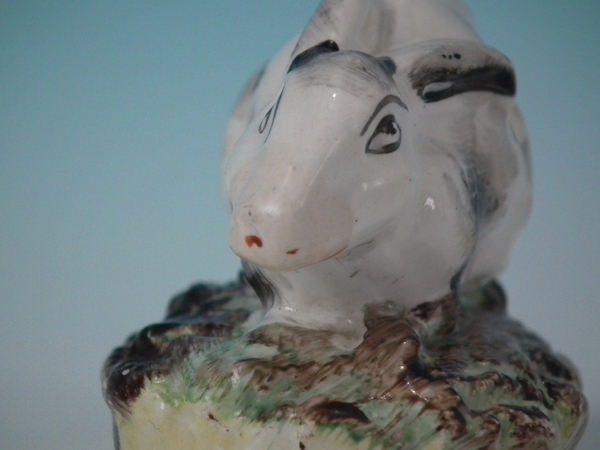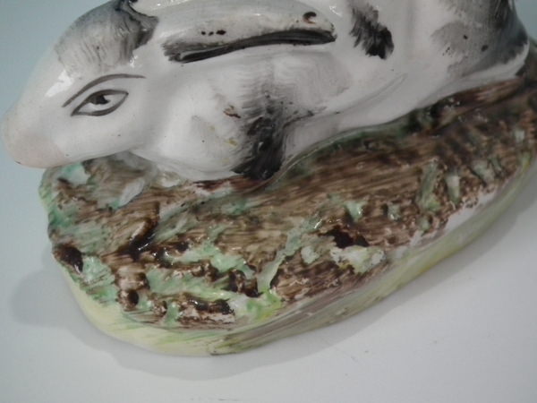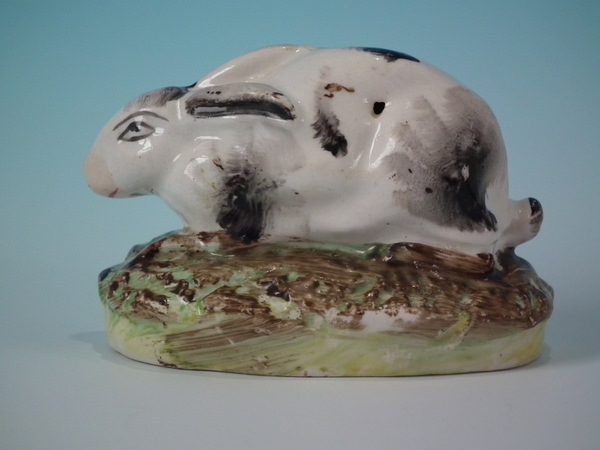 Staffordshire figure which features a rabbit, recumbent on an oval base.