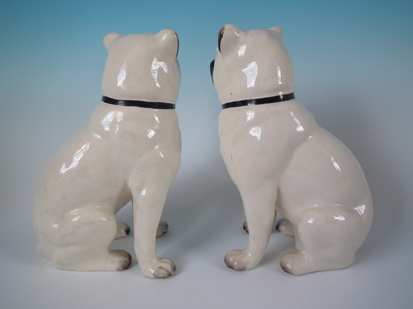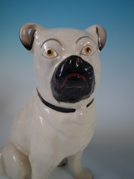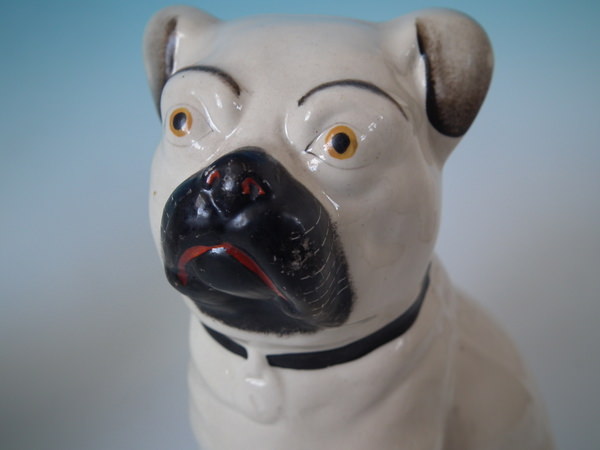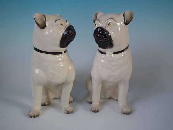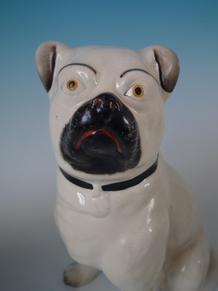 Victorian, circa 1880. Tallest is 9.4ins high, 4.3ins wide, 6.1ins depth. Pair of Staffordshire figures which feature a pug, seated directly on the ground, no base.