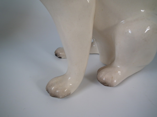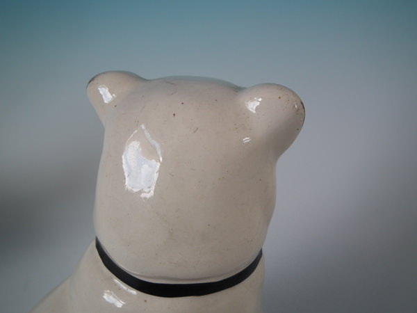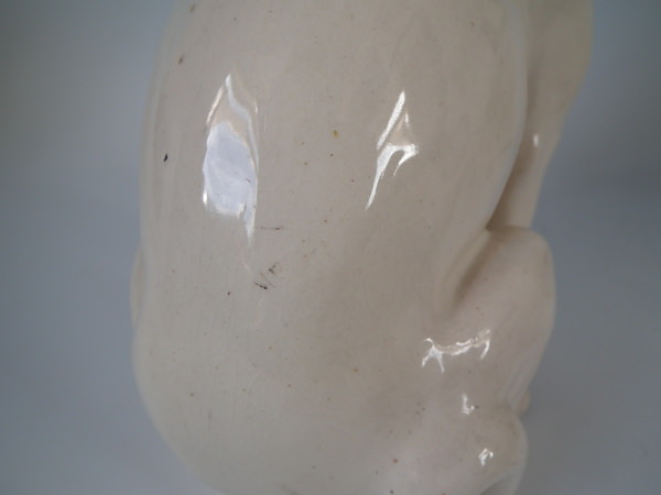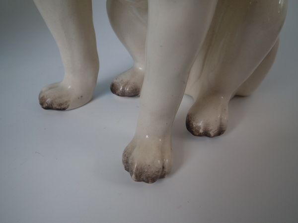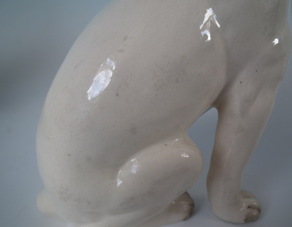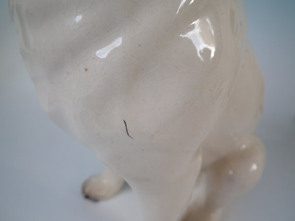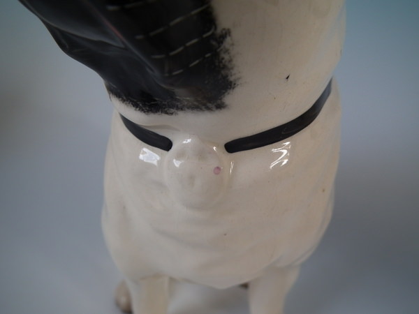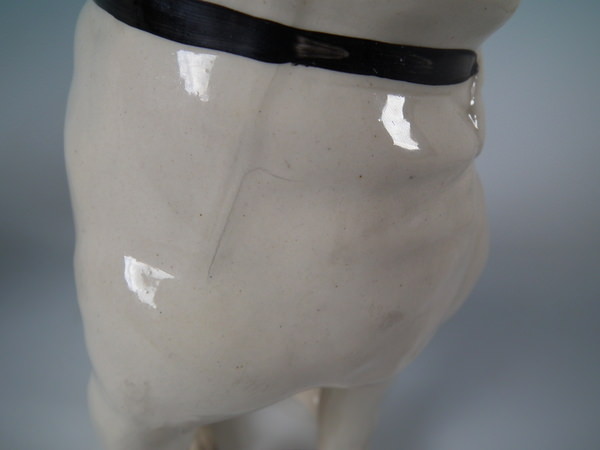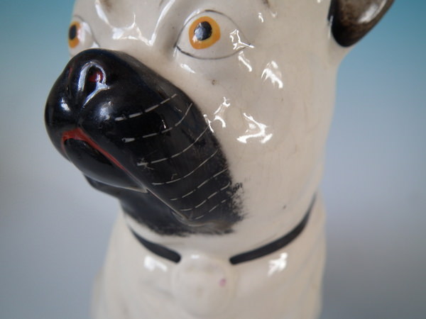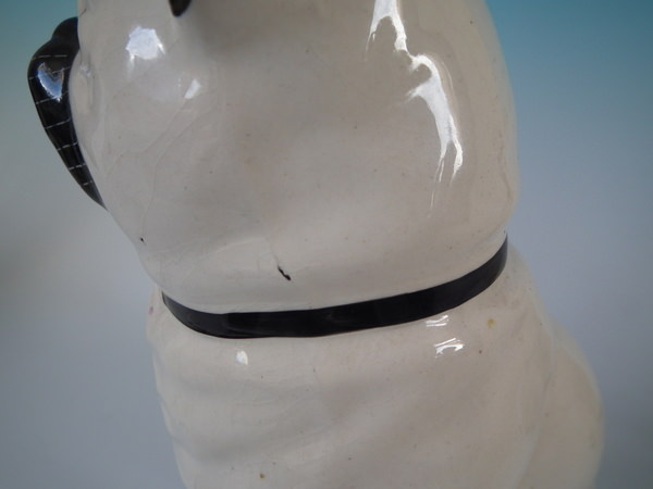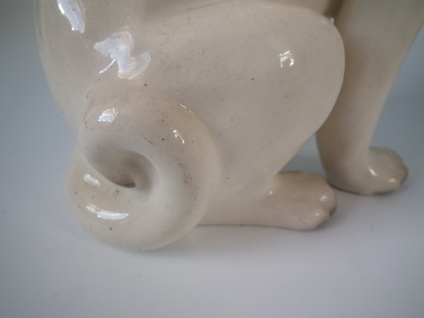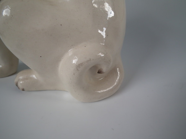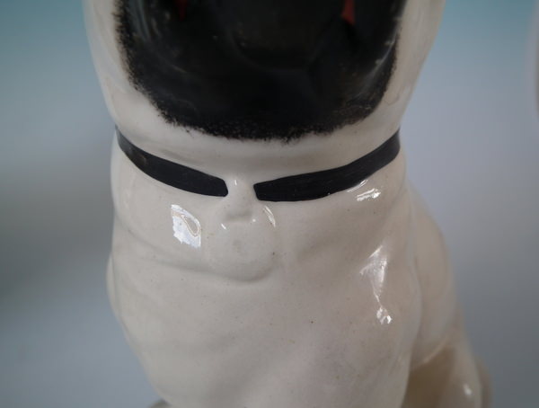 KILN EFFECTS: over glazed shrinkage line to the pug's right side.