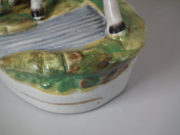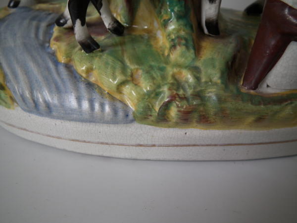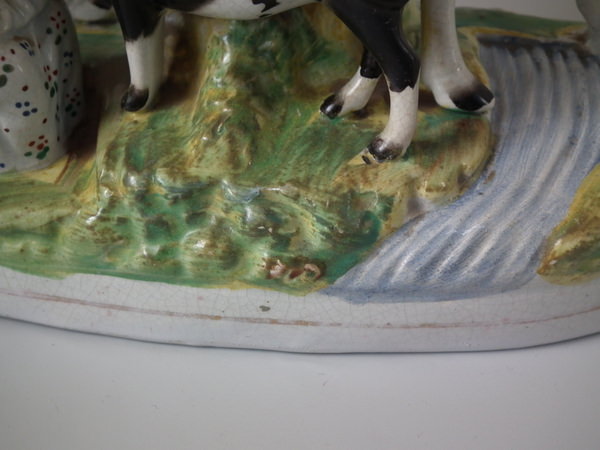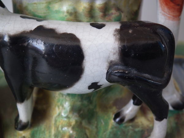 Pair Staffordshire cow, calf & milkmaid spill vases