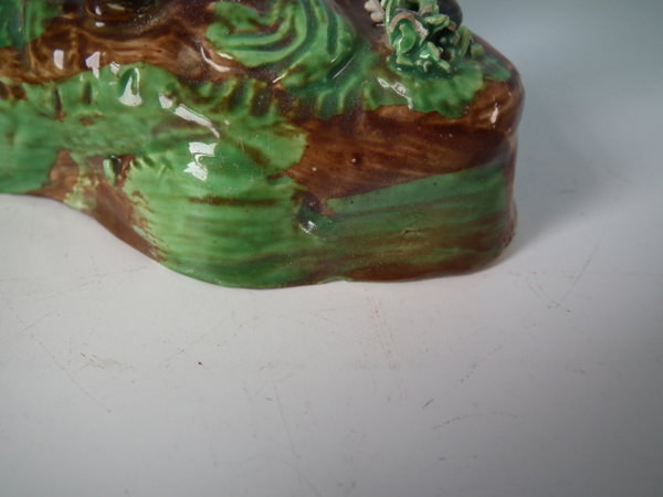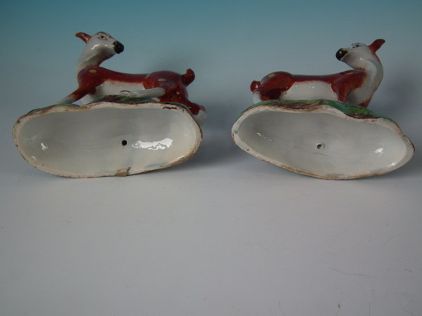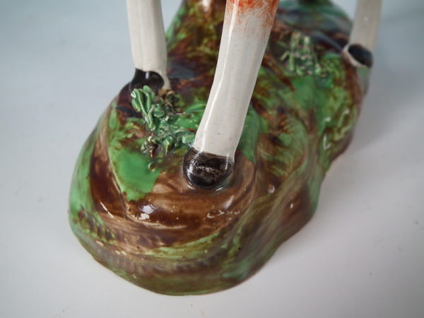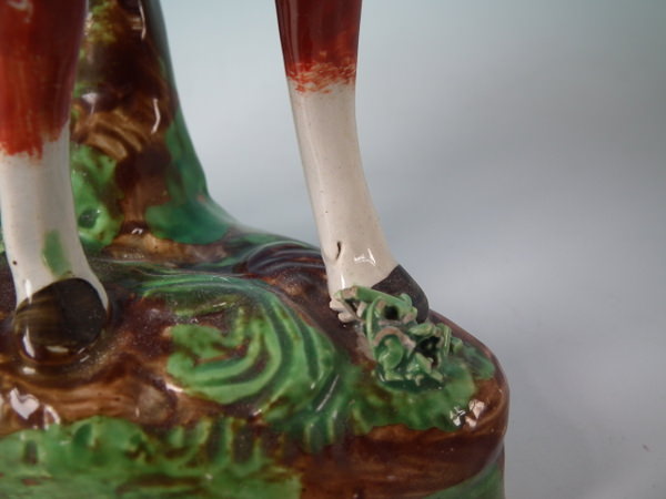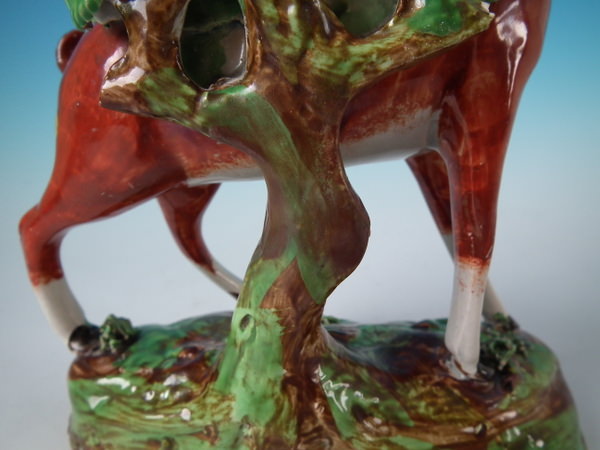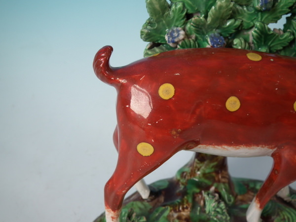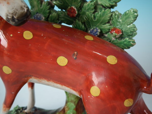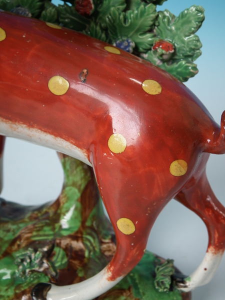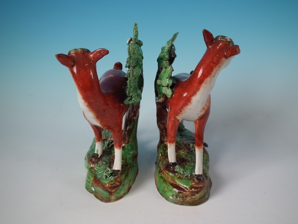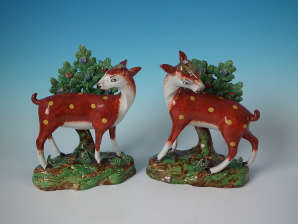 pre-Victorian, circa 1820. Tallest is 7.5ins high, 5.9ins wide, 2.8ins depth. Pair of Staffordshire pearlware bocage figures which feature deer, stood on a shaped base.