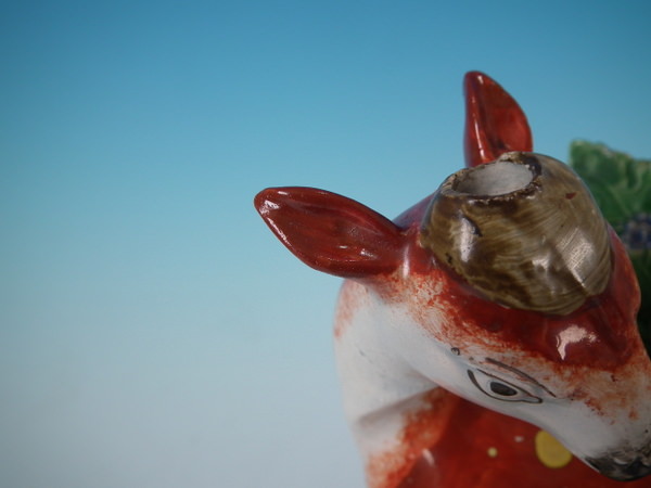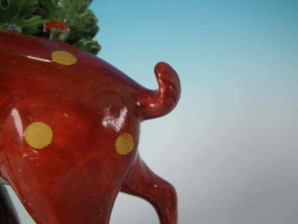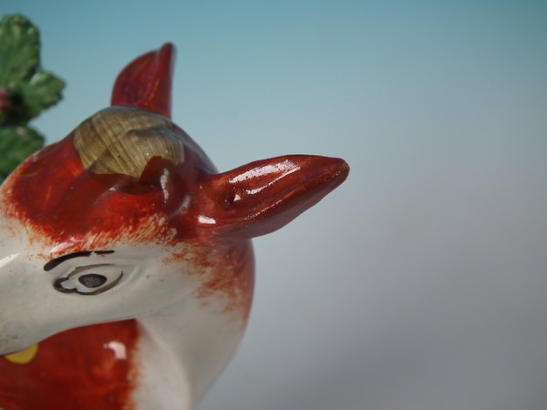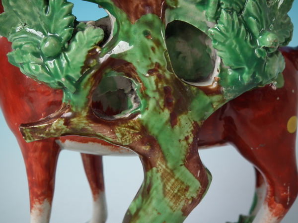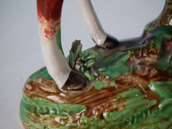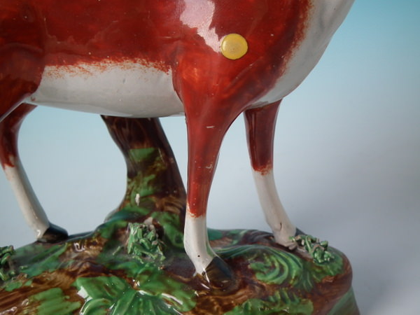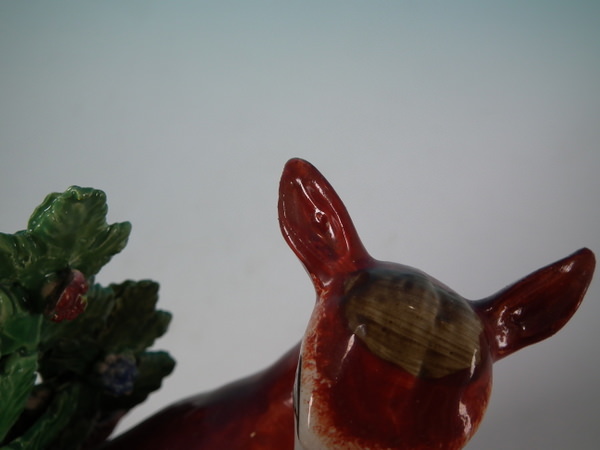 Left facing: Generally good. KILN EFFECTS: kiln detritus caught in the glaze to the deer's body and ground;
