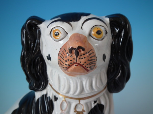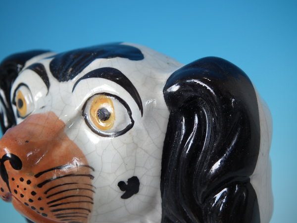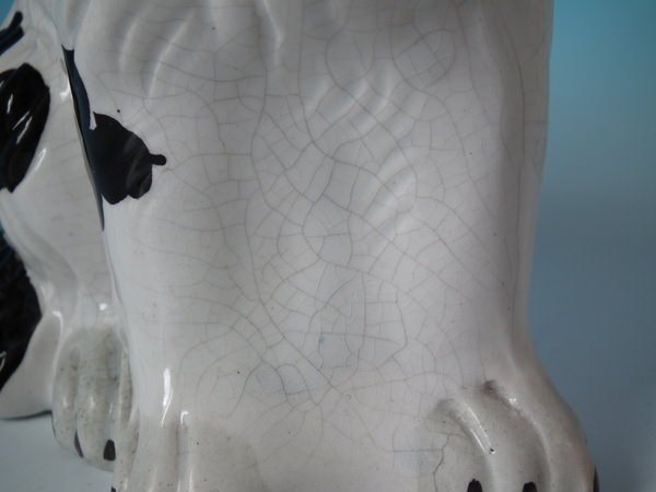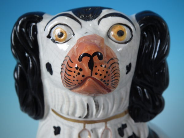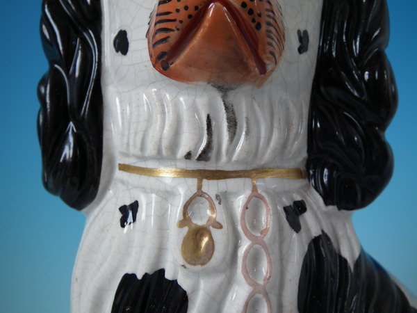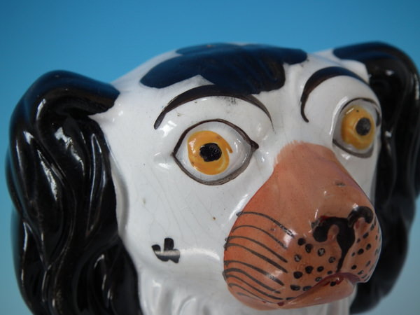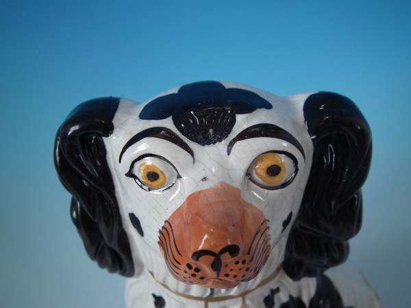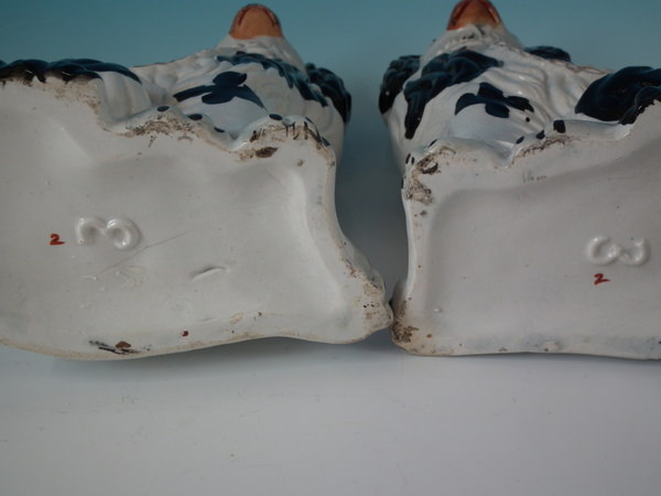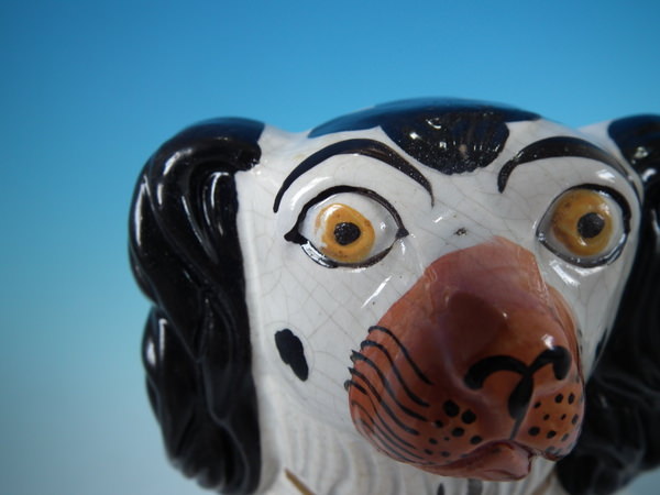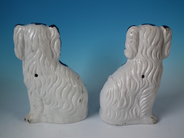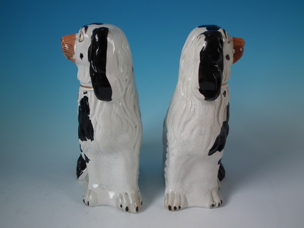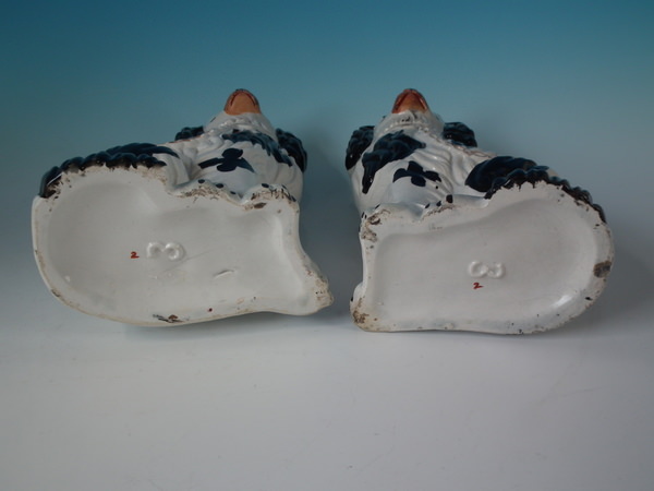 Victorian, circa 1860. Tallest is 8.9ins high, 6.1ins wide, 3.5ins depth. Pair of Staffordshire figures which feature a spaniel, seated directly on the ground, no base.