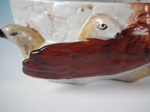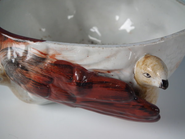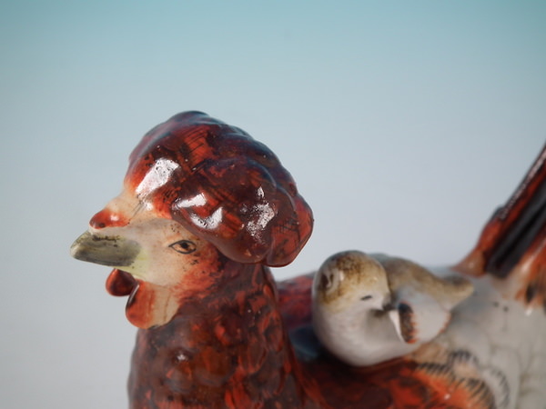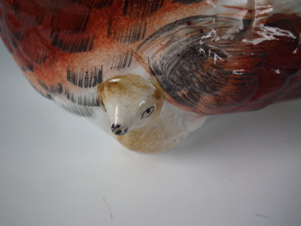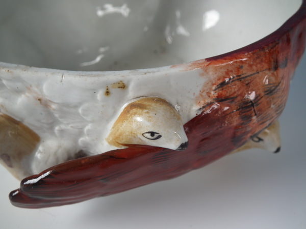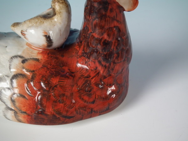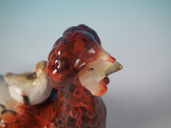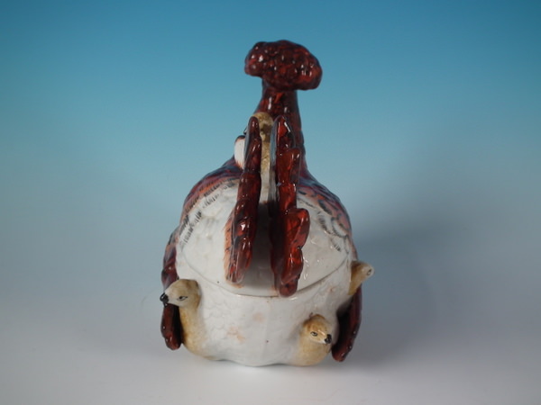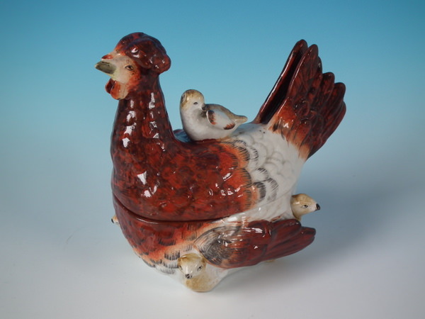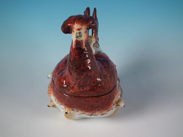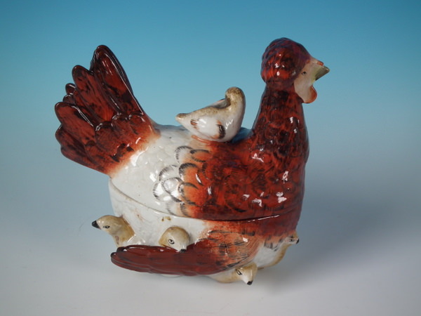 Victorian, circa 1860. 6.5ins high, 6.7ins wide, 5.1ins depth. Staffordshire tureen with cover which features a hen with her seven chicks,