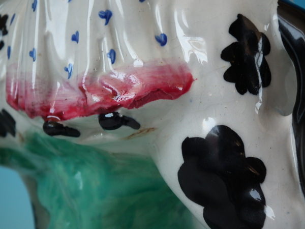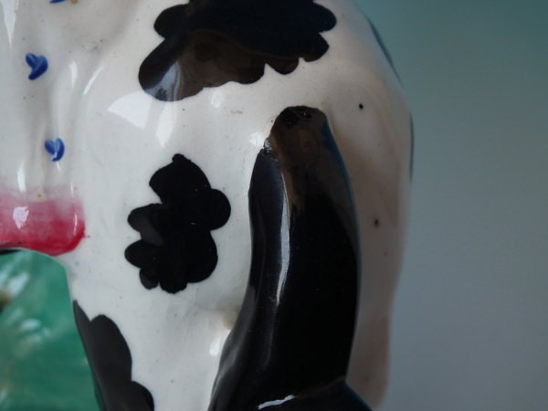 Staffordshire figure with a childhood theme which features a girl lying on the back of a black and white Disraeli dog, stood on an oval base.