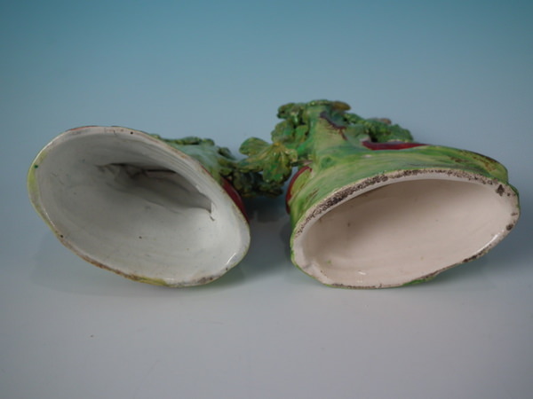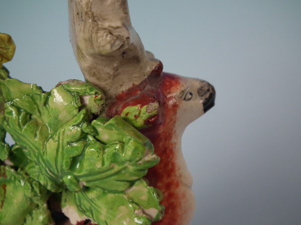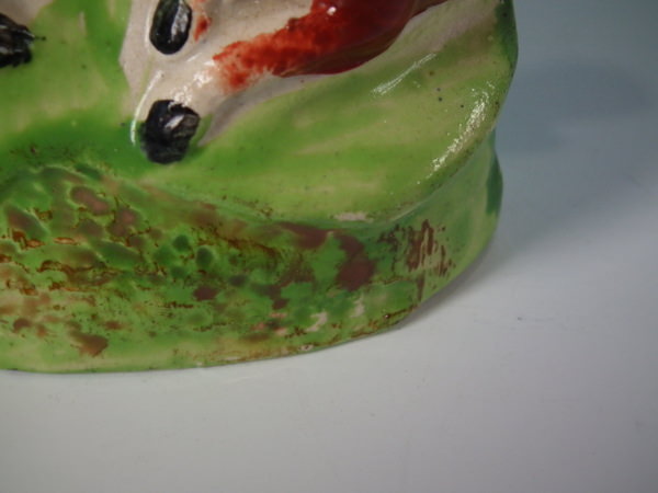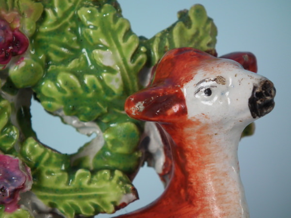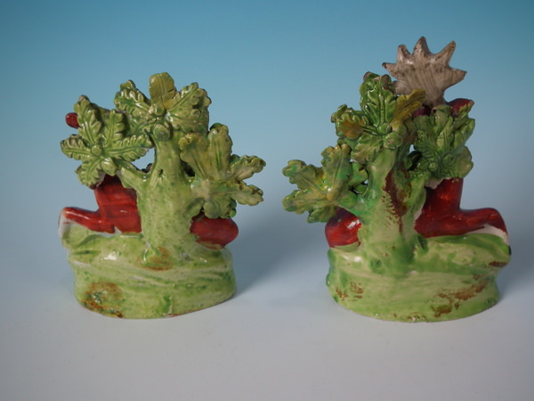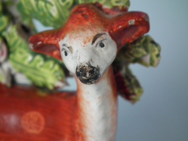 pre-Victorian, circa 1820. Tallest is 4.5ins high, 3.7ins wide, 1.8ins depth. Pair of Staffordshire pearlware bocage figures which feature a stag and doe, recumbent on an oval hollow base. Multi-coloured version. Decorated 'in the round' - decoration to front and reverse.