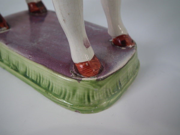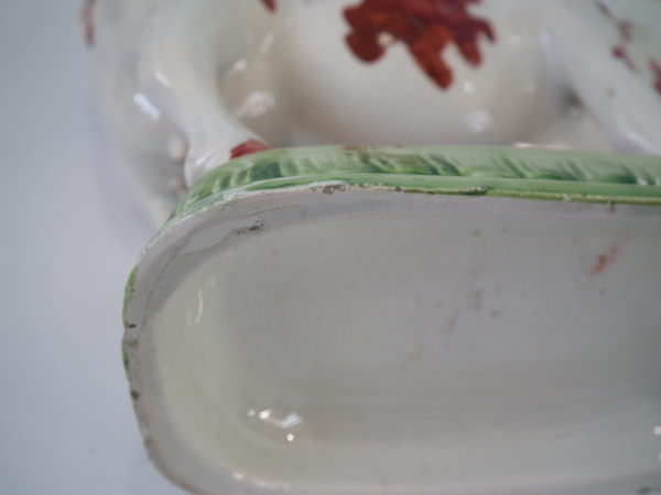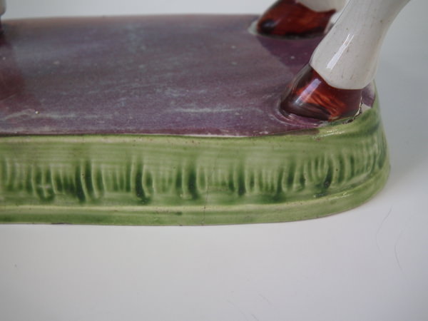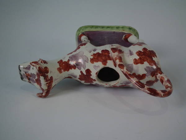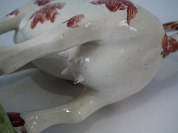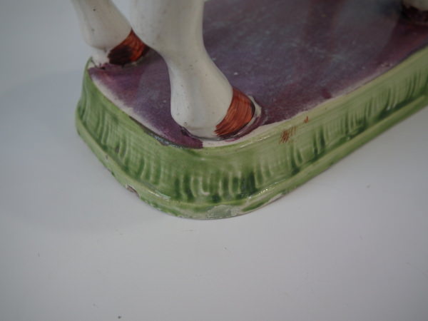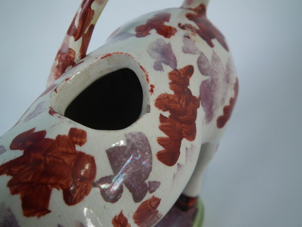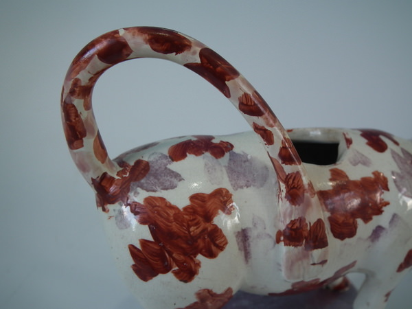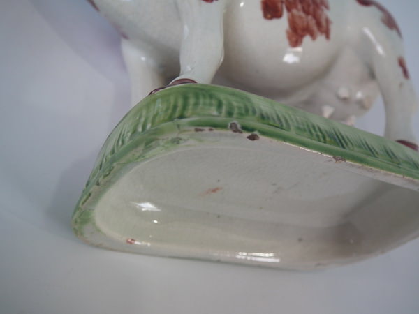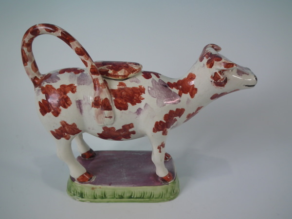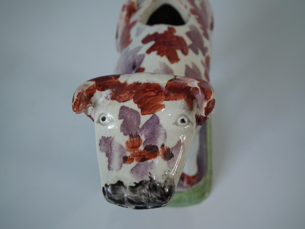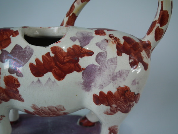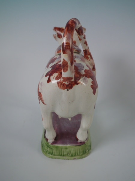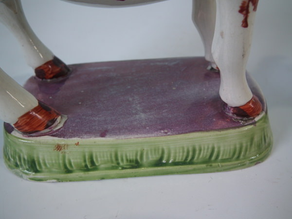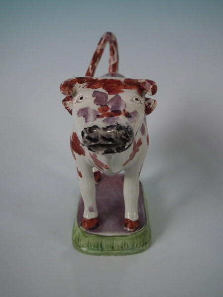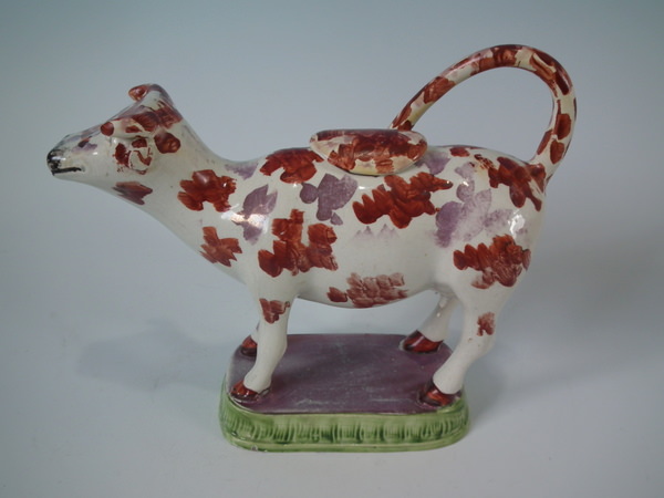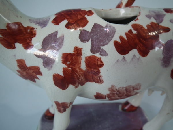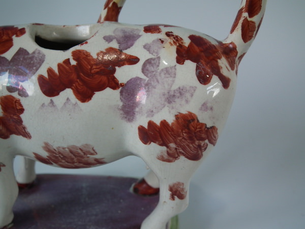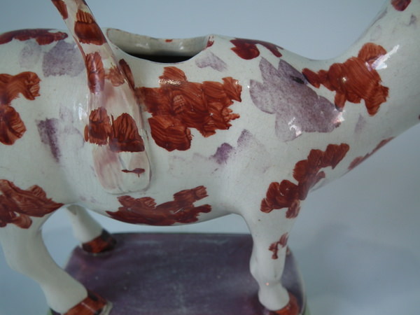 pre-Victorian, circa 1830. 5.9ins high, 7.5ins wide, 2.6ins depth. Staffordshire pearlware cow creamer with a pastoral theme which features a cow, stood on a rectangular base.