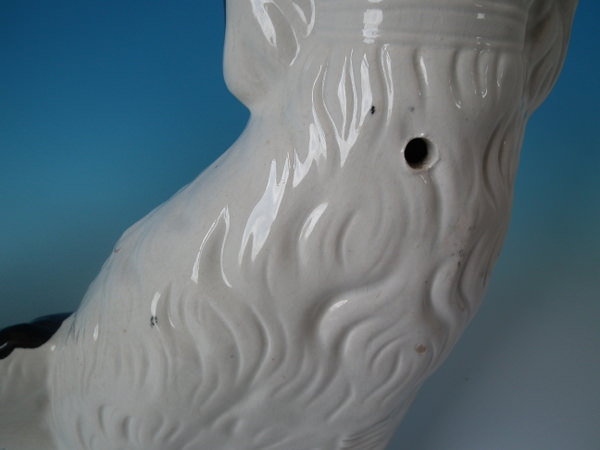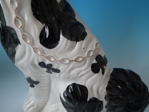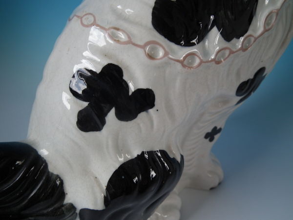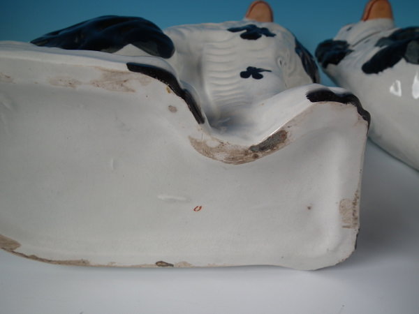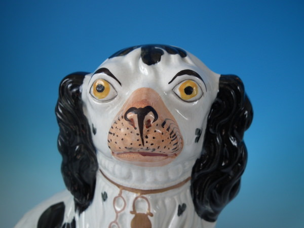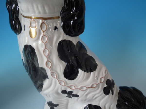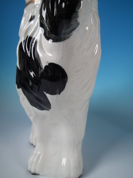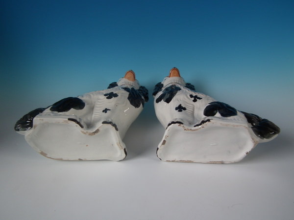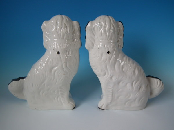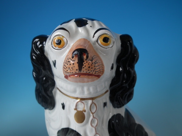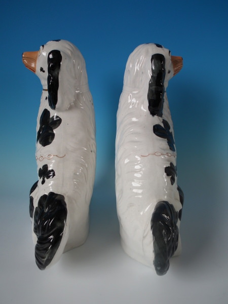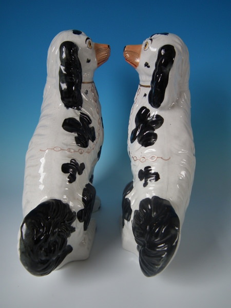 Victorian, circa 1860. Tallest is 12.2ins high, 9.8ins wide, 3.7ins depth. Pair of Staffordshire figures which feature a spaniel, seated directly on the ground, no base.