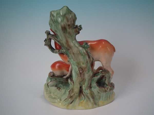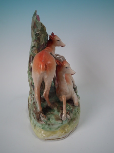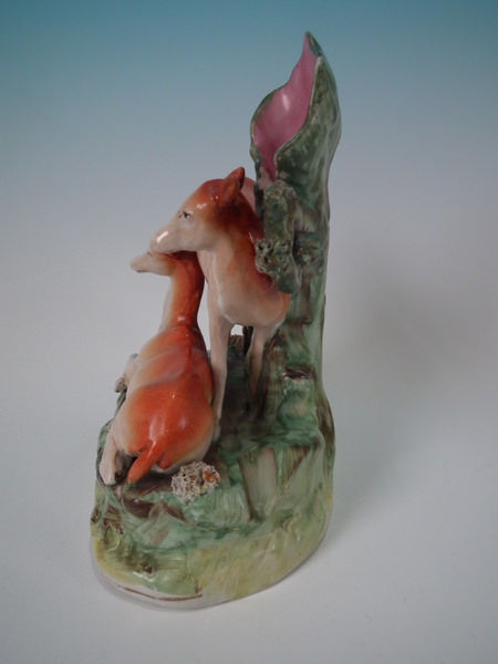 Victorian, circa 1860. 8.7ins high, 0.7ins wide, 4.7ins depth. Parr Factory Staffordshire spill vase which features a stag and doe, stood on a shaped base. Multi-coloured version. Dull gilt base line.