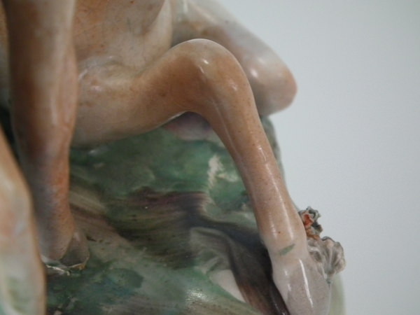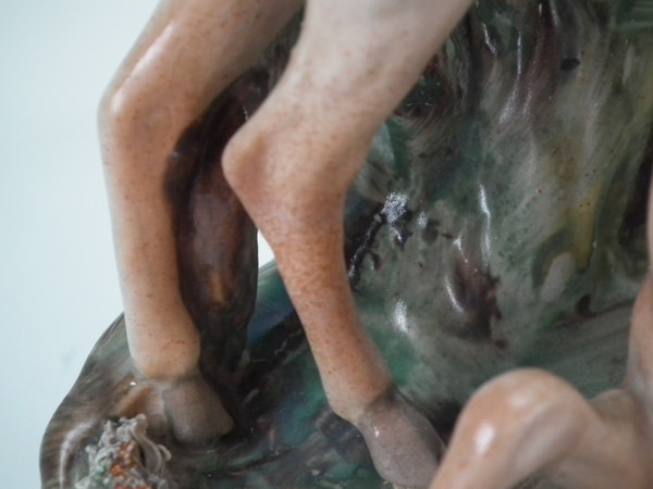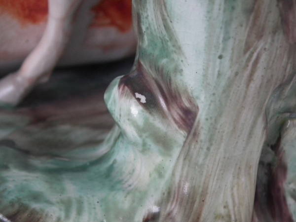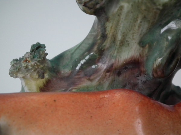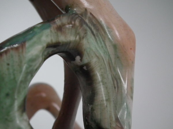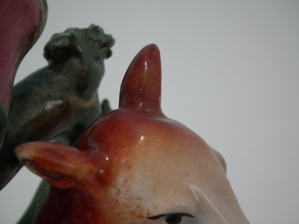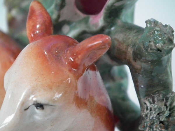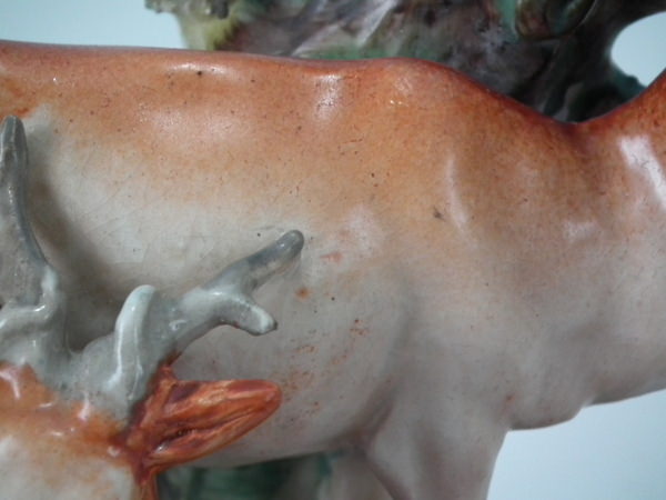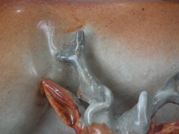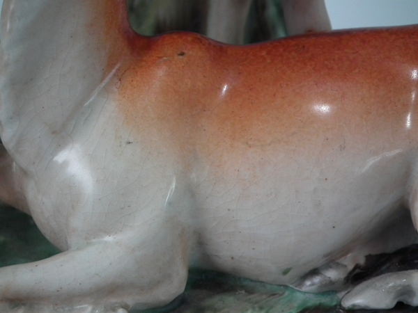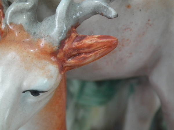 KILN EFFECTS: flecks of stray coloured glaze to the stag and doe.