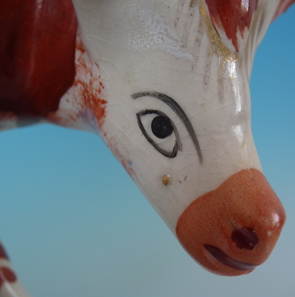 kiln grit caught in the glaze to the cow's face.