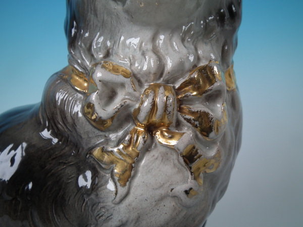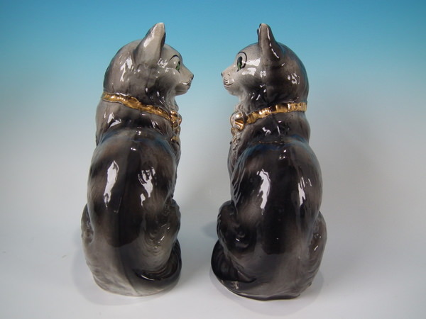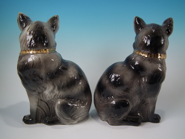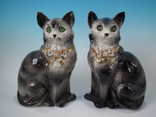 Pair Staffordshire grey cats with glass eyes
