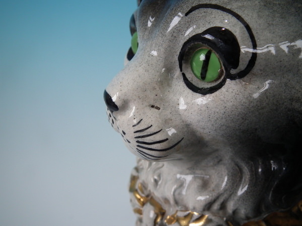 small firing hole to the left side of cat's nose;