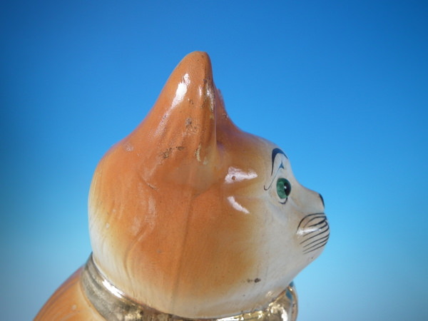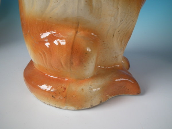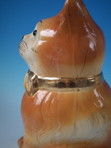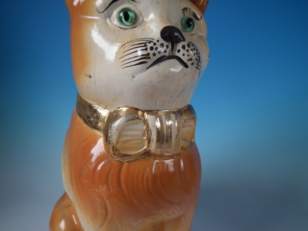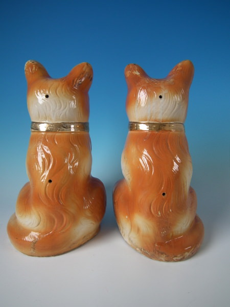 Victorian, circa 1890. Tallest is 12.2ins high, 6.7ins wide, 7.9ins depth. Pair of Bo'ness Staffordshire figures which feature a cat with glass eyes,