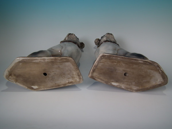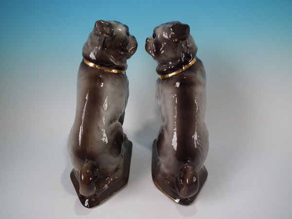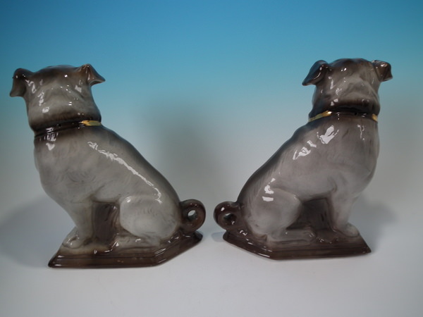 Victorian, circa 1900. Tallest is 11.8ins high, 9.8ins wide, 4.9ins depth. Pair of Staffordshire glass eyed figures which feature pugs, seated on a shaped base.