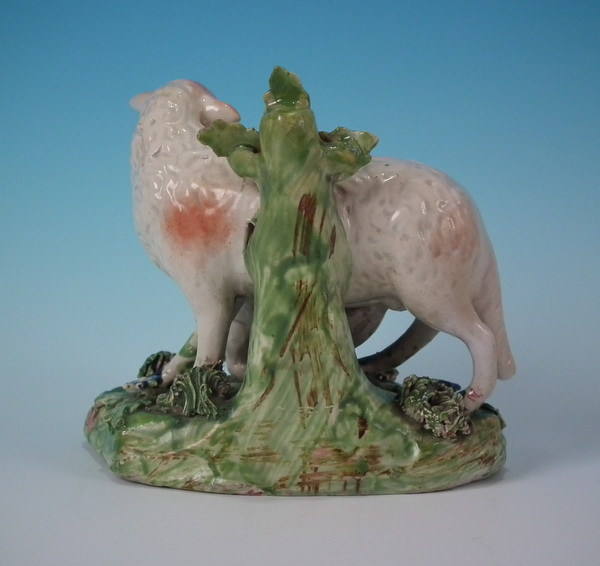 Staffordshire pearlware bocage figure which features a ewe and lamb, stood on a shaped base.