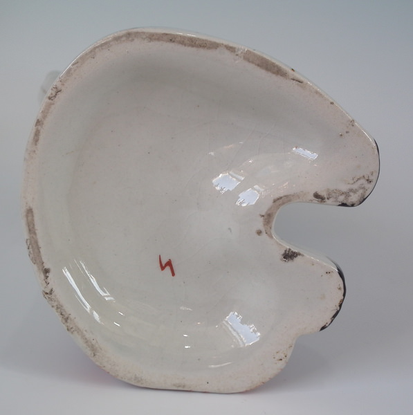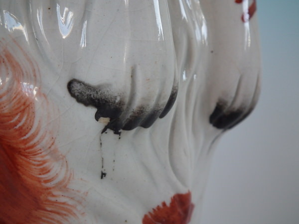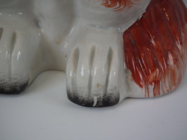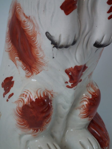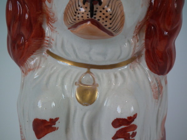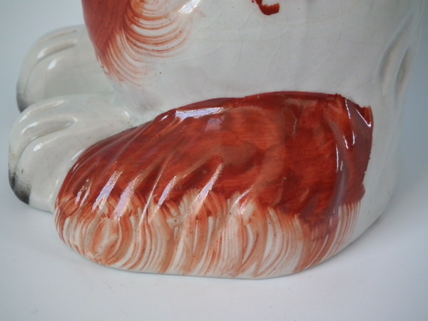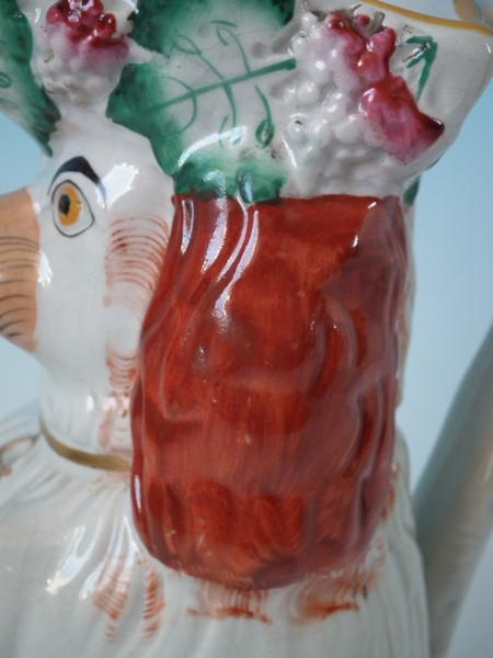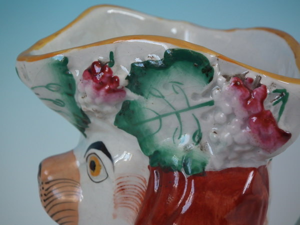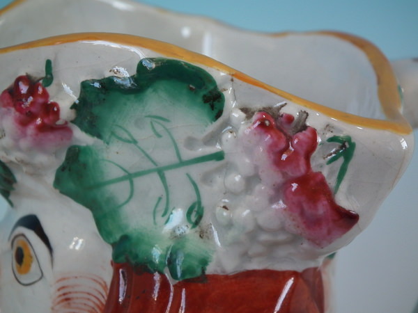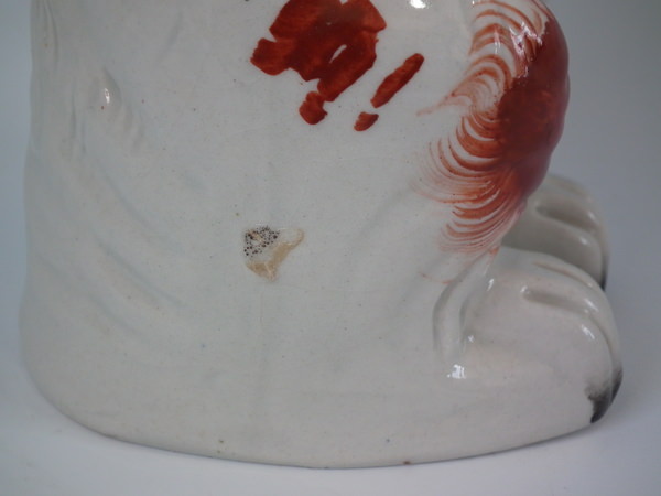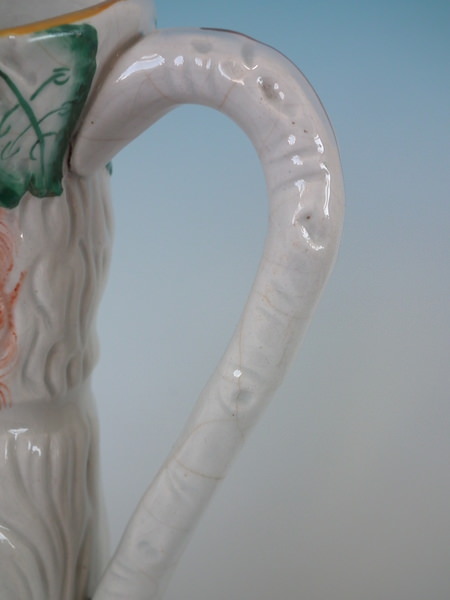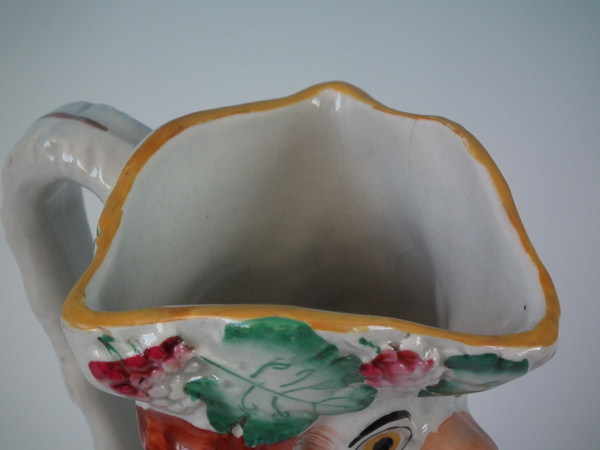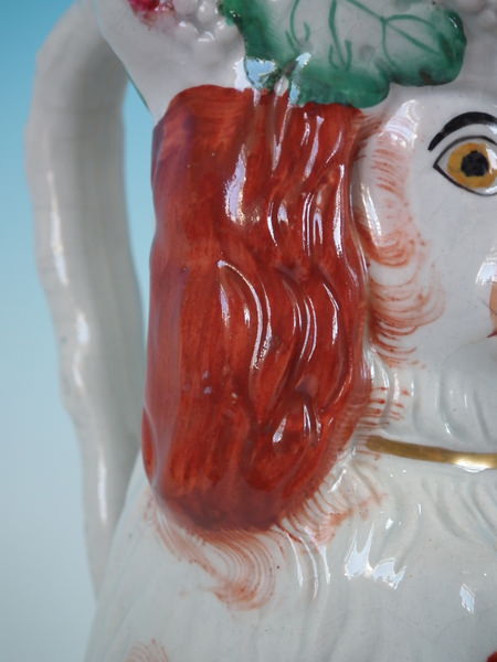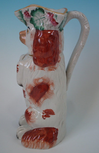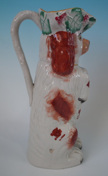 Staffordshire jug/pitcher which features a begging spaniel modeled with tricorn hat, floral decoration and ochre line around rim, stood directly on the ground, no base.