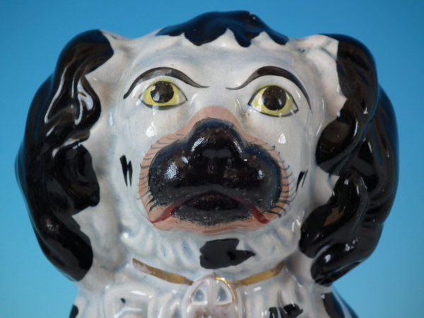 Pair of Staffordshire figures which feature a spaniel, seated directly on the ground, no base.