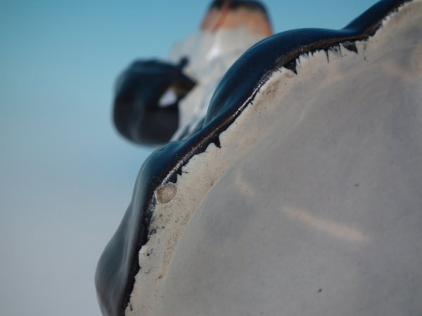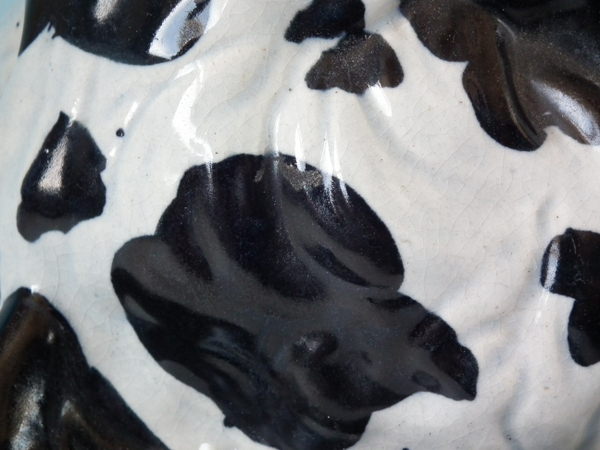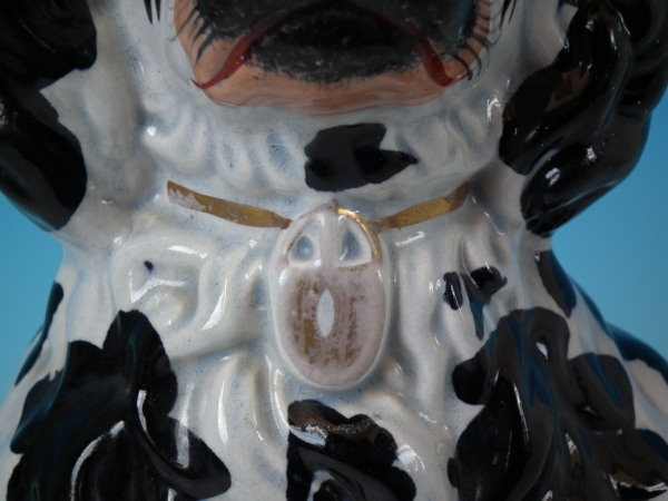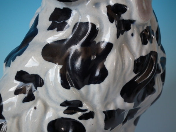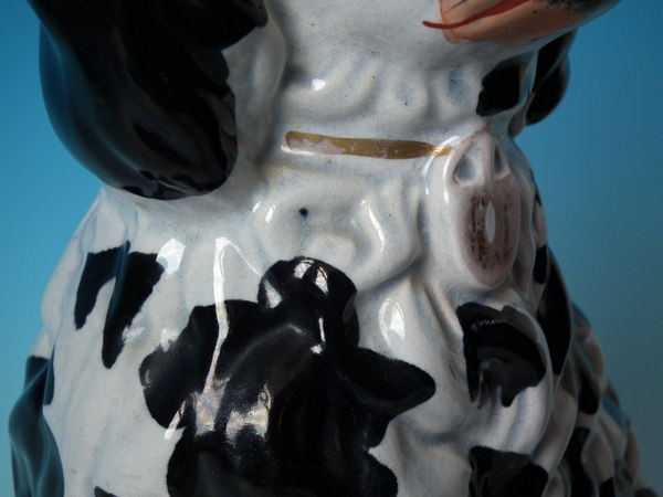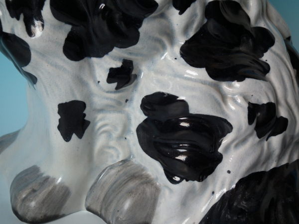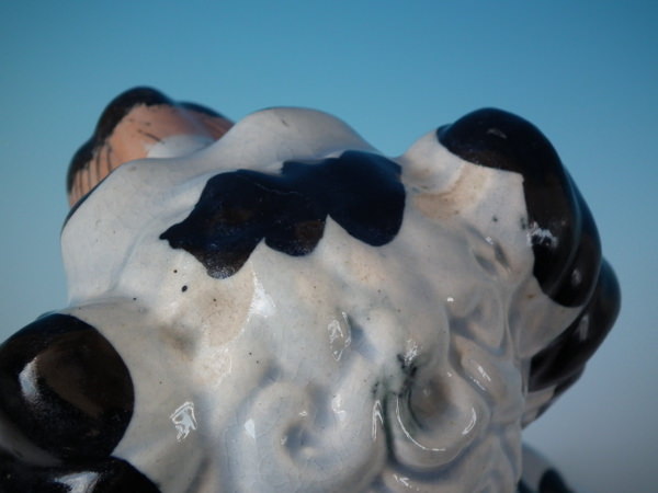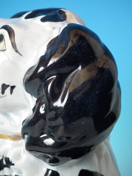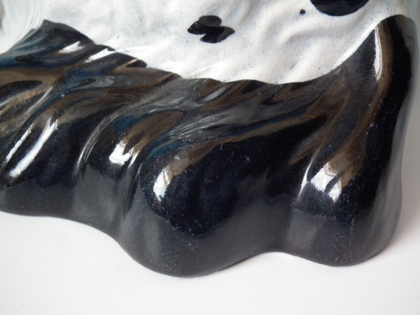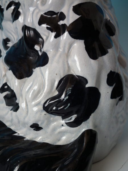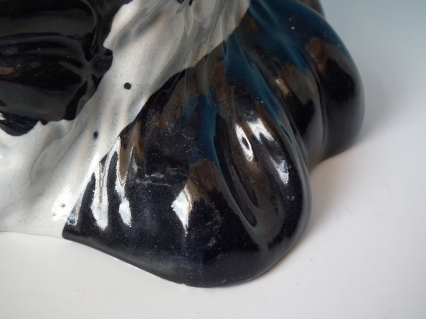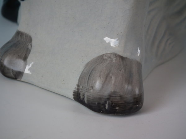 KILN EFFECTS: flecks of stray black glaze to the dog's body;