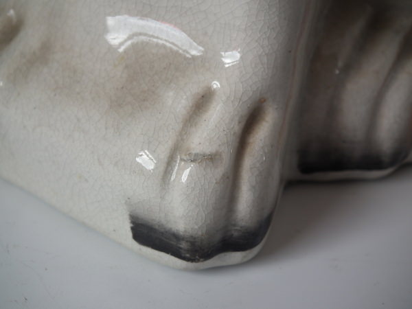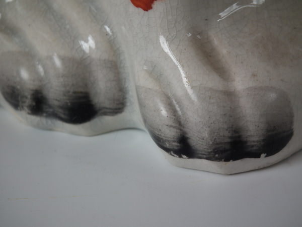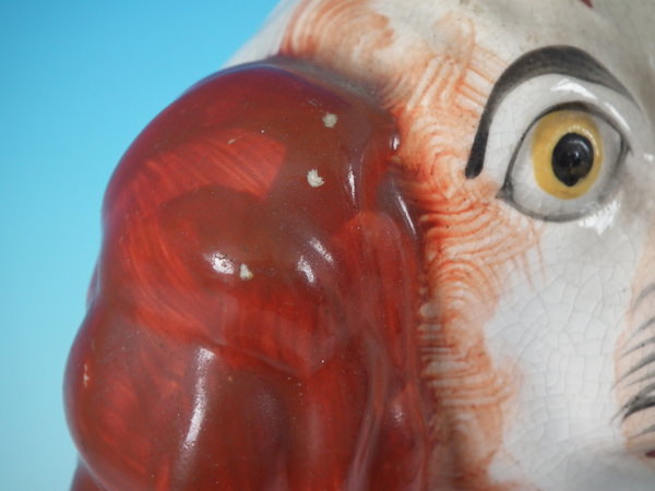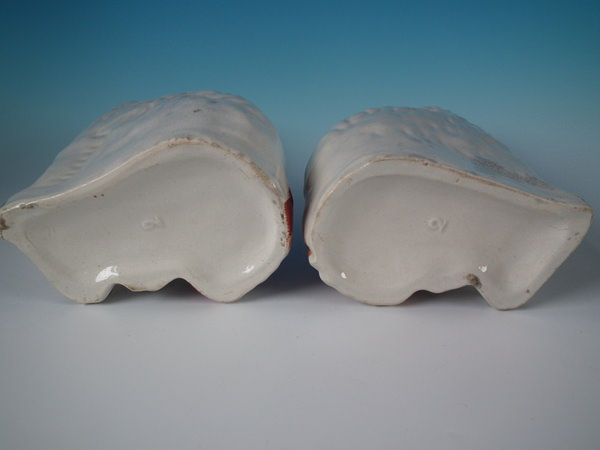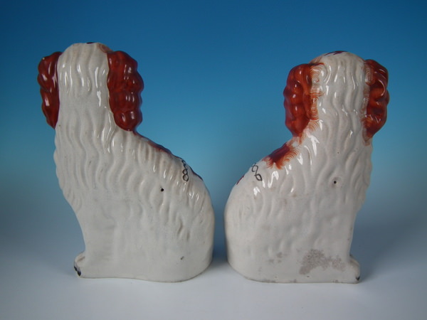 Victorian, circa 1860. Tallest is 9.8ins high, 6.3ins wide, 4.1ins depth. Pair of Staffordshire figures which feature a spaniel, seated directly on the ground, no base. Russet and white version. Dull gilt collar and locket.